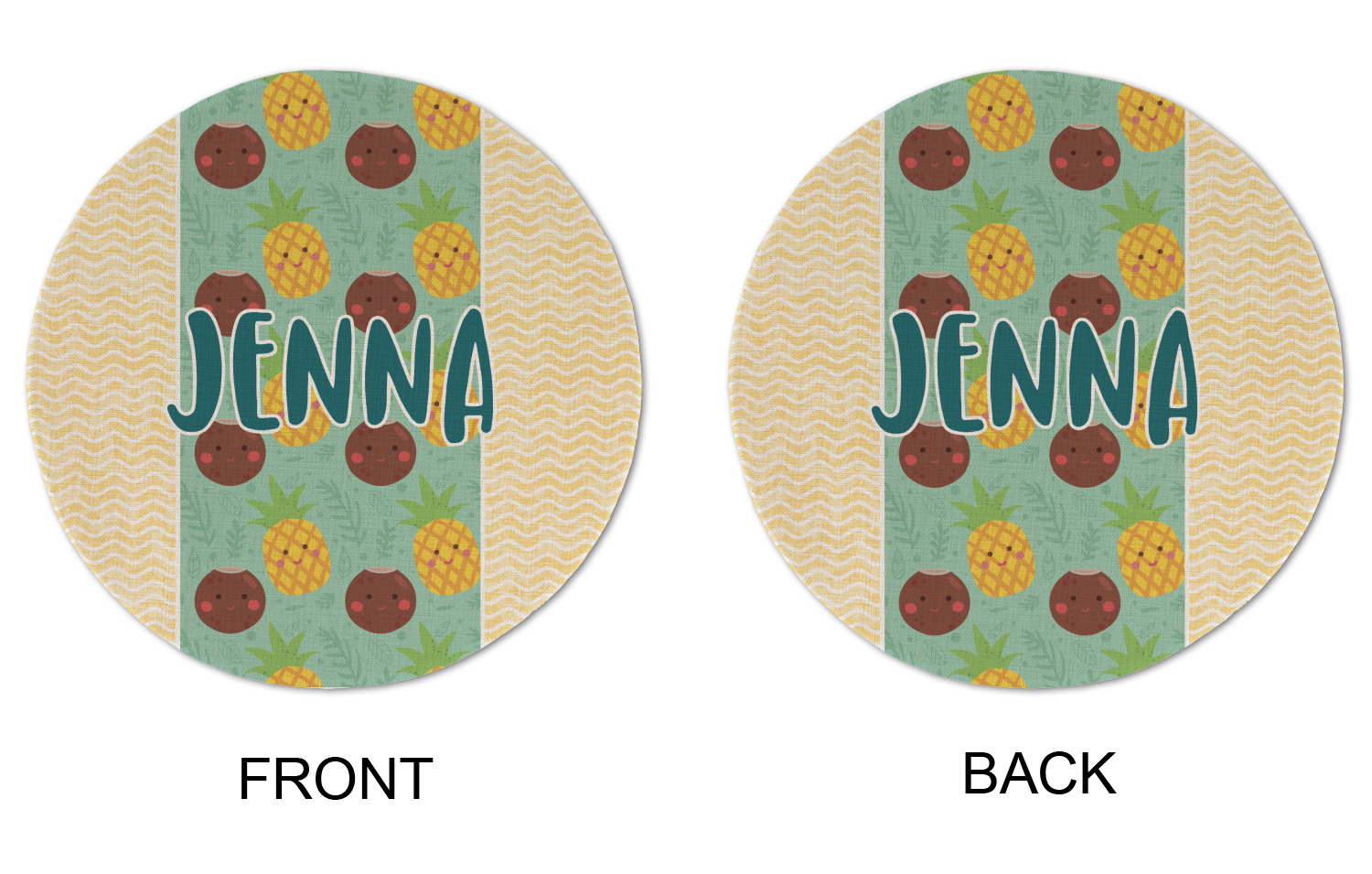 This design is filled with happy coconuts and pineapples to brighten your day. A nice teal color is used behind them, while a yellow chevron is used as the secondary pattern.