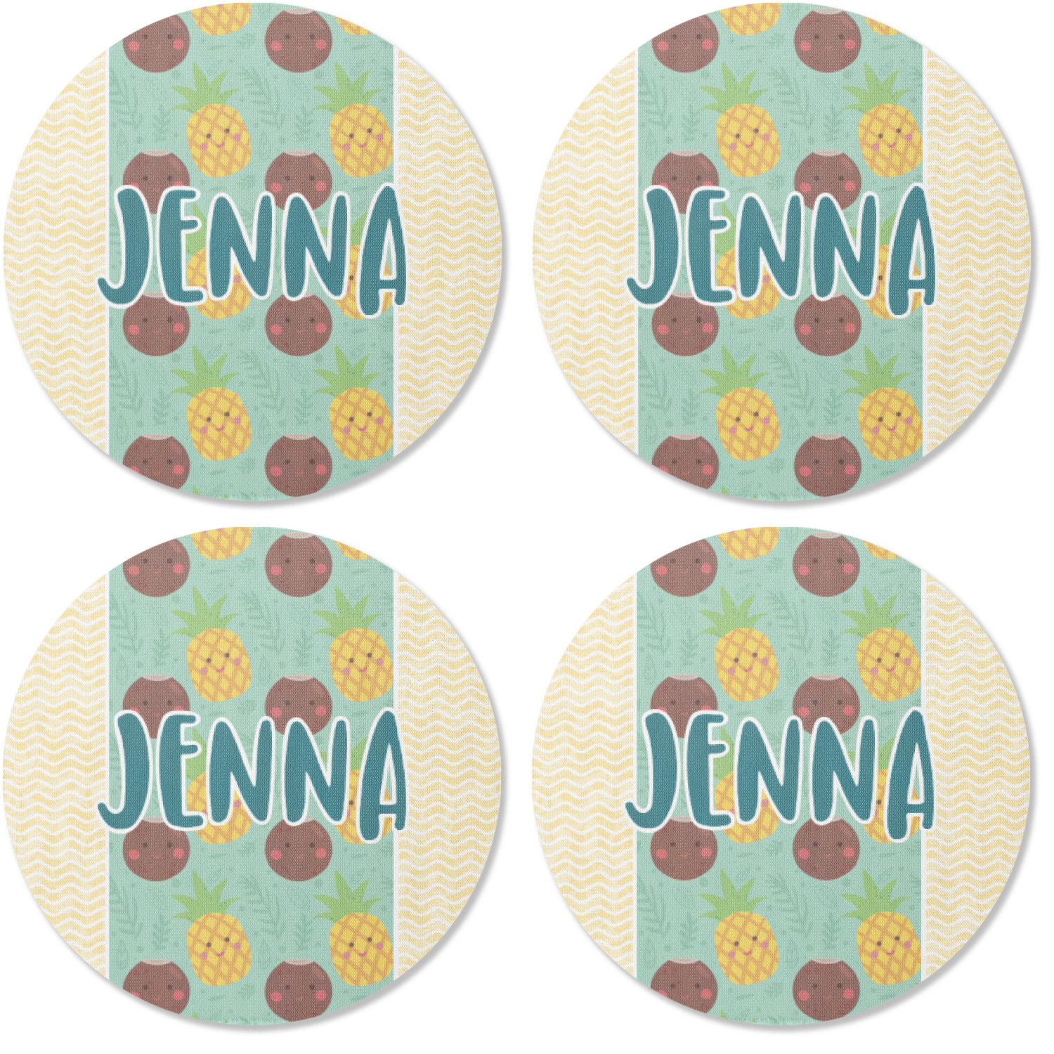 This design is filled with happy coconuts and pineapples to brighten your day. A nice teal color is used behind them, while a yellow chevron is used as the secondary pattern.