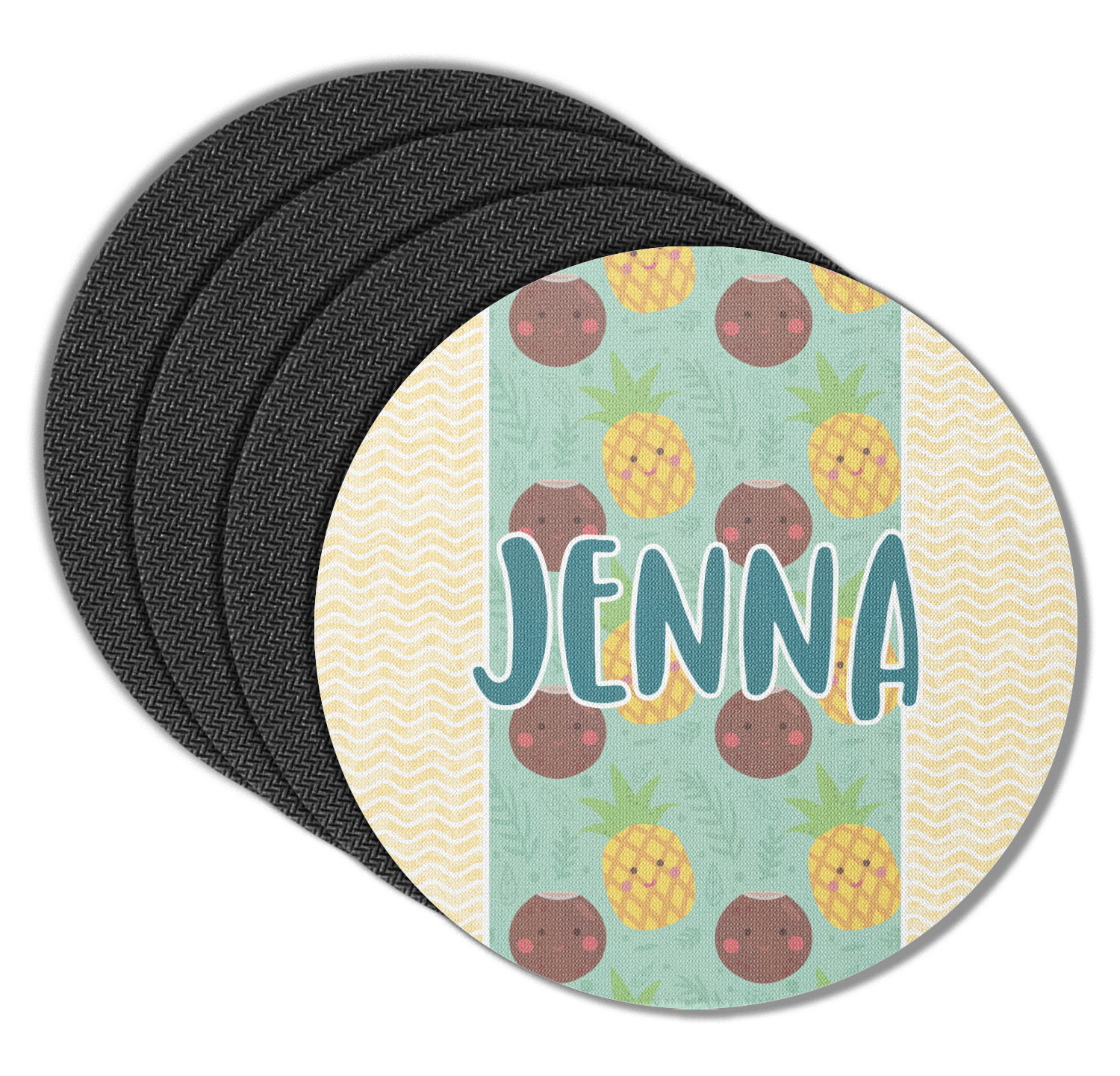 These drink coasters have a smooth, polyester top and a textured, rubber backing on its bottom. The non-slip rubber backing underneath works to keep any spills at bay. At 4 by 4 by 0.25 inches thick, these custom coasters are a suitable size for most drinkware. Your personalization is displayed atop the face of the cup coaster. We sell these rubber coasters in two different shapes: square and round. You can buy each shape as singulars or as a set of 4.