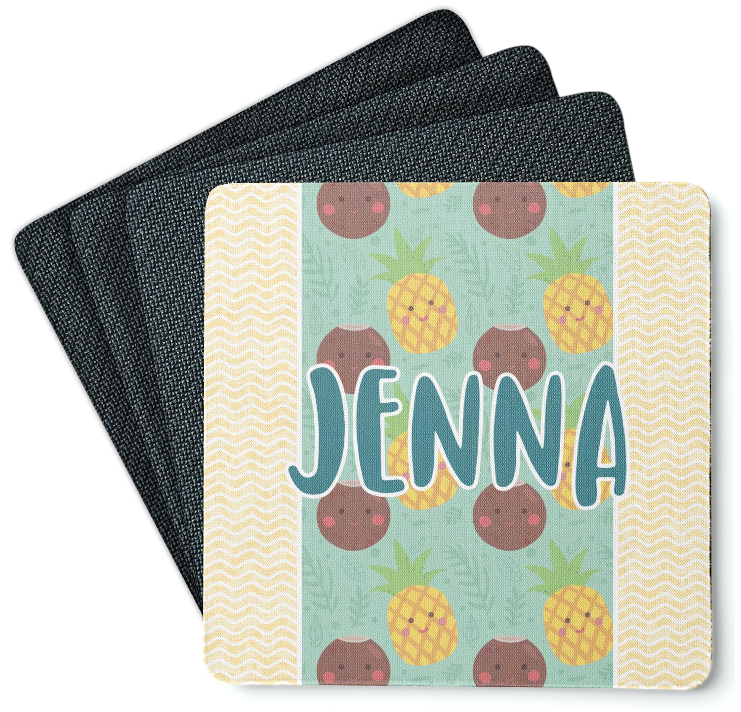 These drink coasters have a smooth, polyester top and a textured, rubber backing on its bottom. The non-slip rubber backing underneath works to keep any spills at bay. At 4 by 4 by 0.25 inches thick, these custom coasters are a suitable size for most drinkware. Your personalization is displayed atop the face of the cup coaster. We sell these rubber coasters in two different shapes: square and round. You can buy each shape as singulars or as a set of 4.