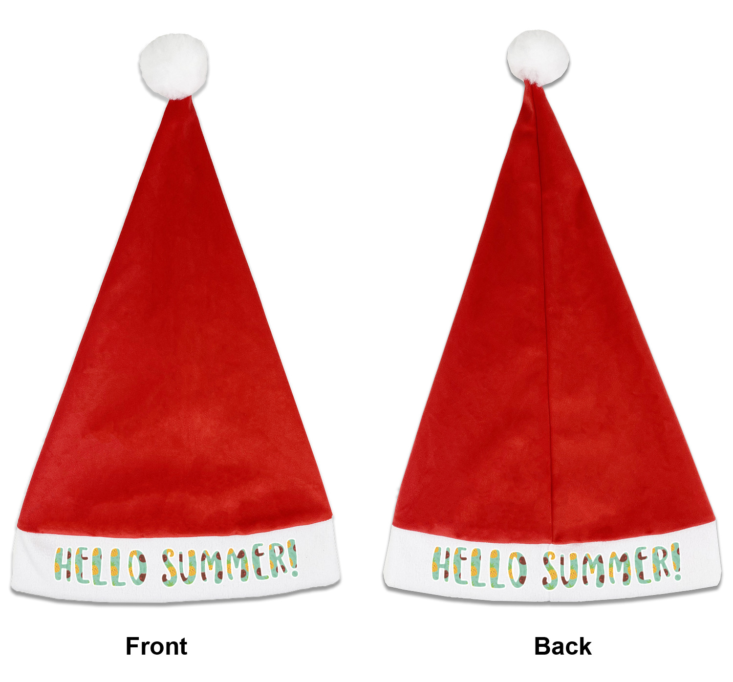 Our Santa hats are a soft, velvety polyester material. These customizable Santa hats are a classic red with white brimming and pom pom ball hanging off the hat tail just like Santa Claus! Each personalized Santa hat is approximately 17.5 L x 11.8 W. We offer two different styles to print your designs on the white brim - front or front & back.
