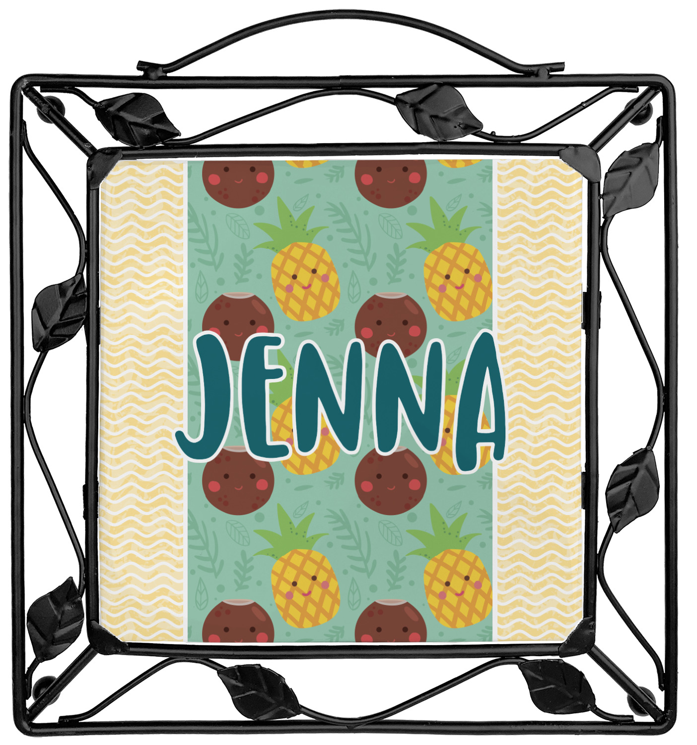 Our square trivets are made from a durable, wrought iron. This model features 4 small half circles, one on each corner, and a larger ring of iron that circles the central, customized tile. Each of the 4 corners has a round foot on its bottom for stability. This trivet is 8.75 by 8.75 inches, but the central tile measures at 6 inches on both sides.