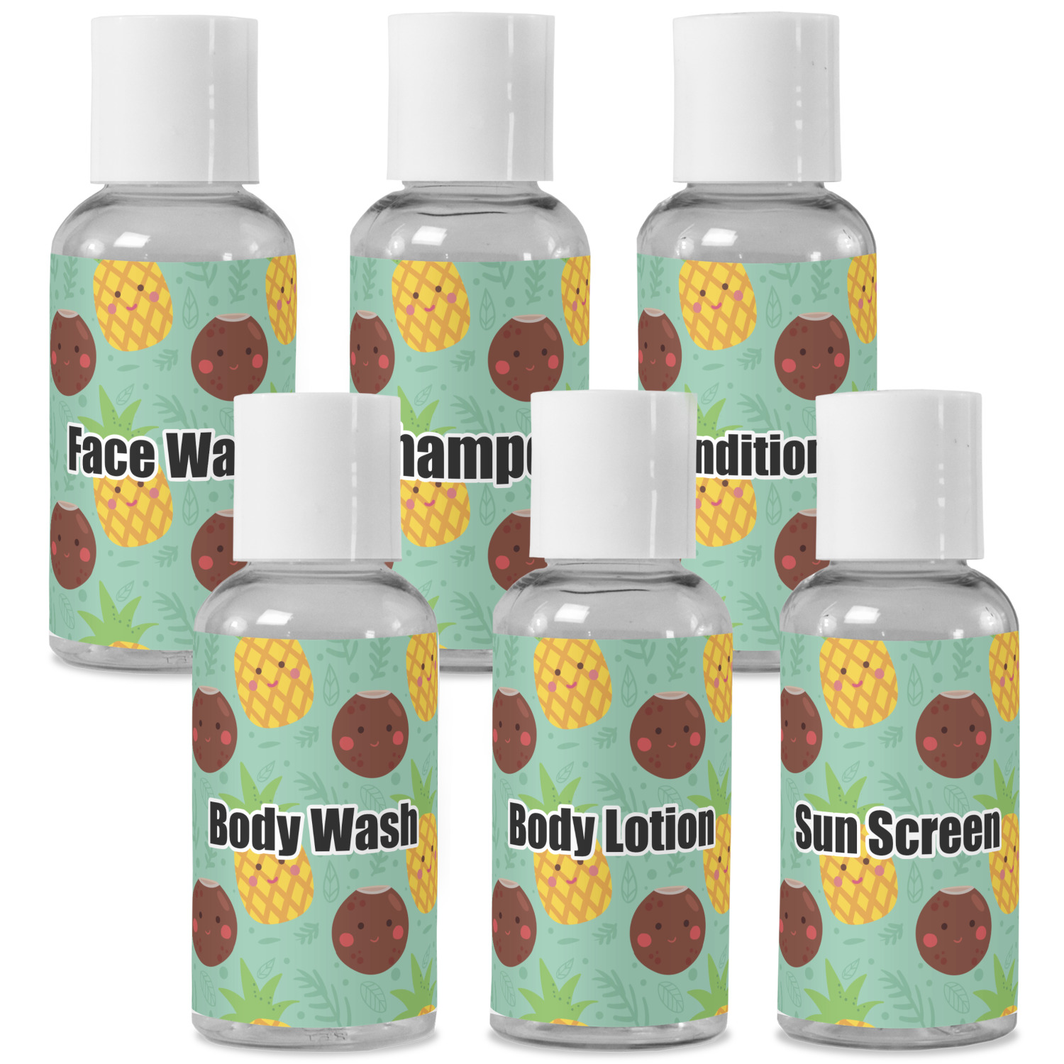These soap and lotion travel bottles are the perfect place to start. Each set comes with 6 clear plastic bottles with white pop top lids. The bottles are cylindrical and can hold approximately 2.7oz. Perfect for plane travel!