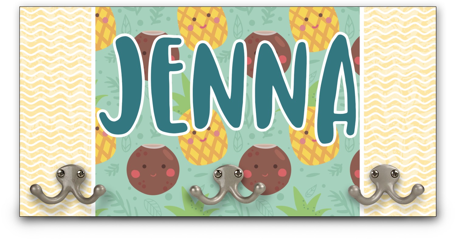 This coat rack is the perfect way to add some personality to your wall or entryway. The board is made of a strong maple that is approximately 16" x 8". The three 2-prong hooks are a sturdy metal that have three screws attaching them to the board. Your design is printed right onto the front of the board while the back and sides are a simple black.