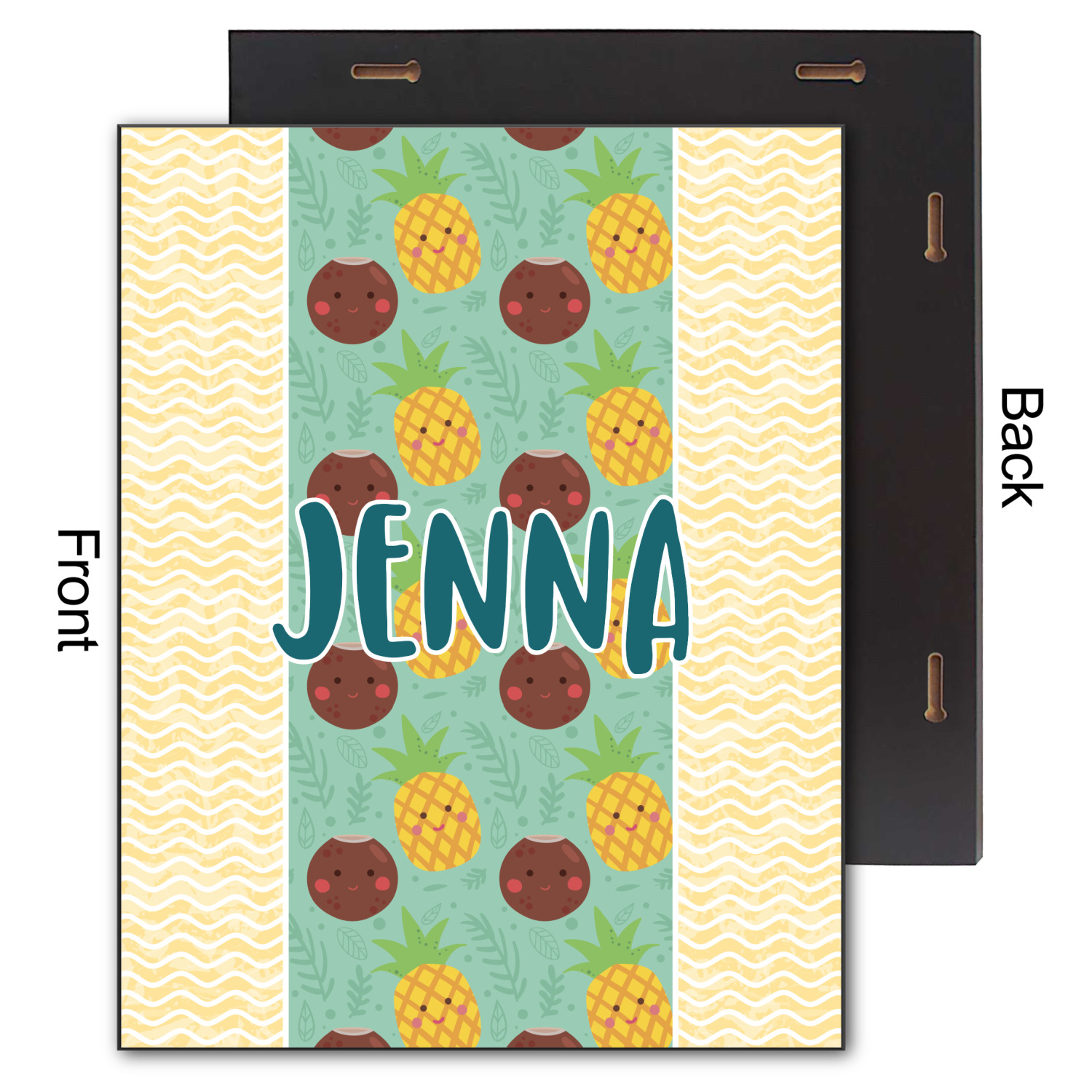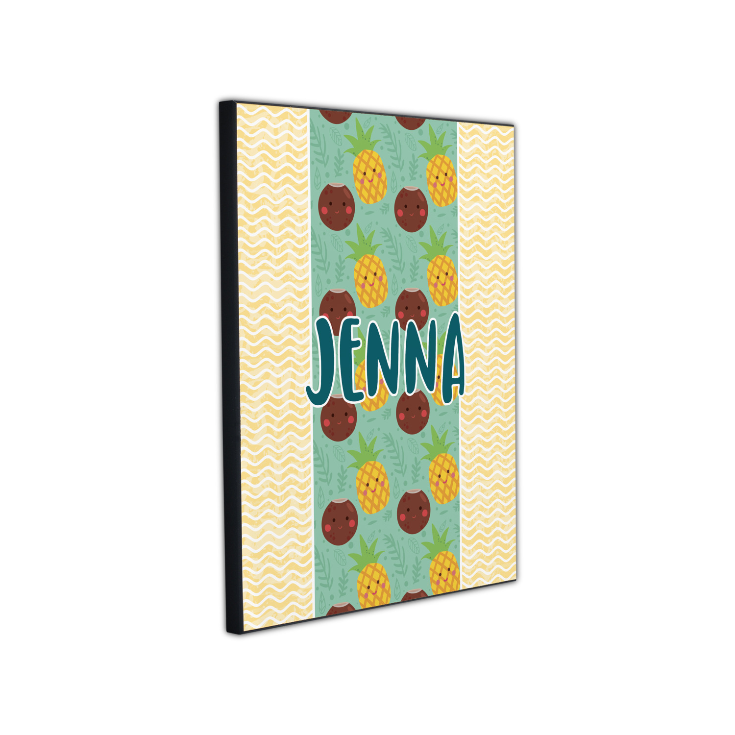 This design is filled with happy coconuts and pineapples to brighten your day. A nice teal color is used behind them, while a yellow chevron is used as the secondary pattern.