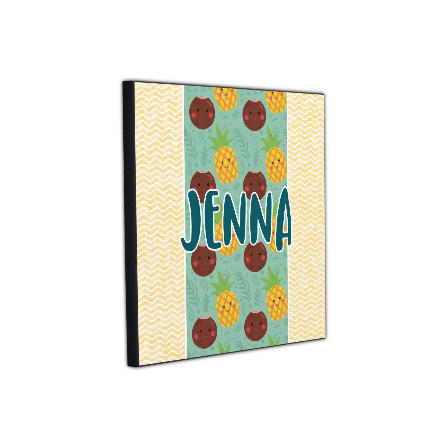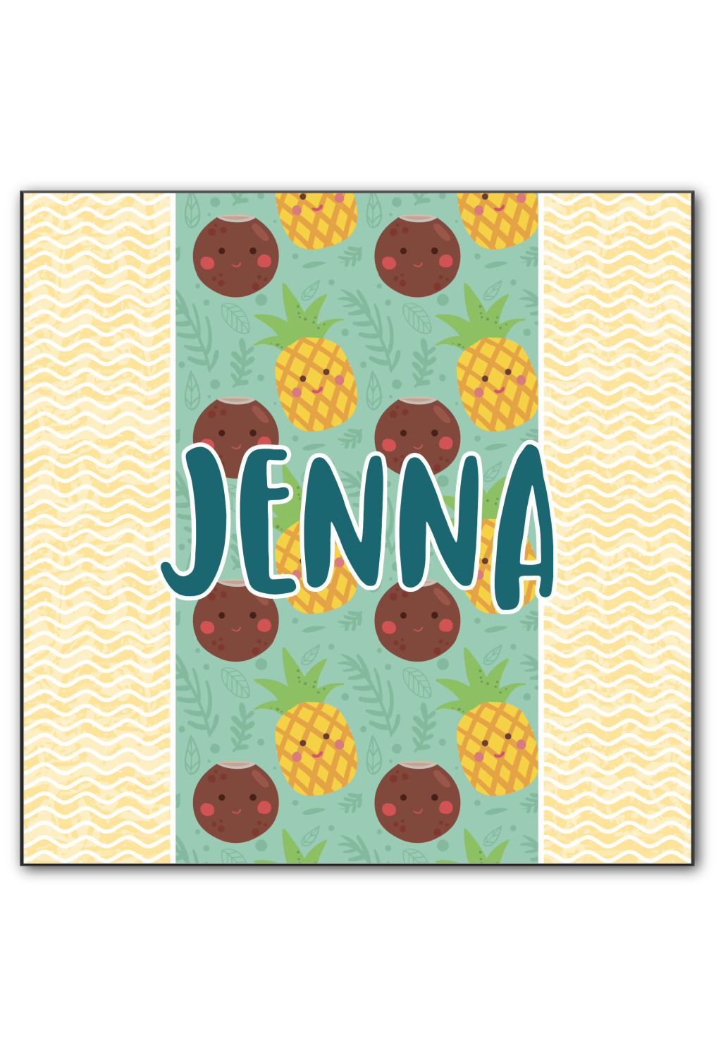 This design is filled with happy coconuts and pineapples to brighten your day. A nice teal color is used behind them, while a yellow chevron is used as the secondary pattern.