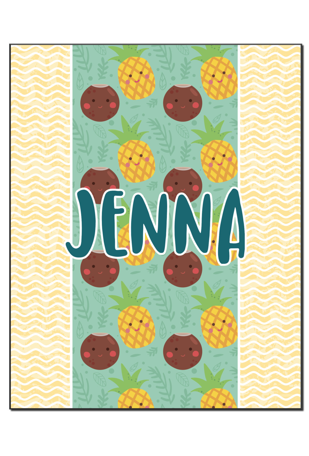 This design is filled with happy coconuts and pineapples to brighten your day. A nice teal color is used behind them, while a yellow chevron is used as the secondary pattern.