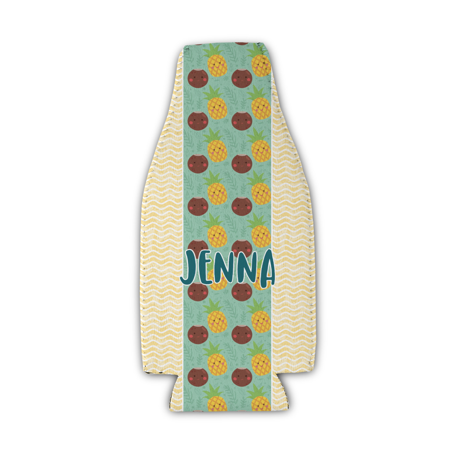 This design is filled with happy coconuts and pineapples to brighten your day. A nice teal color is used behind them, while a yellow chevron is used as the secondary pattern.