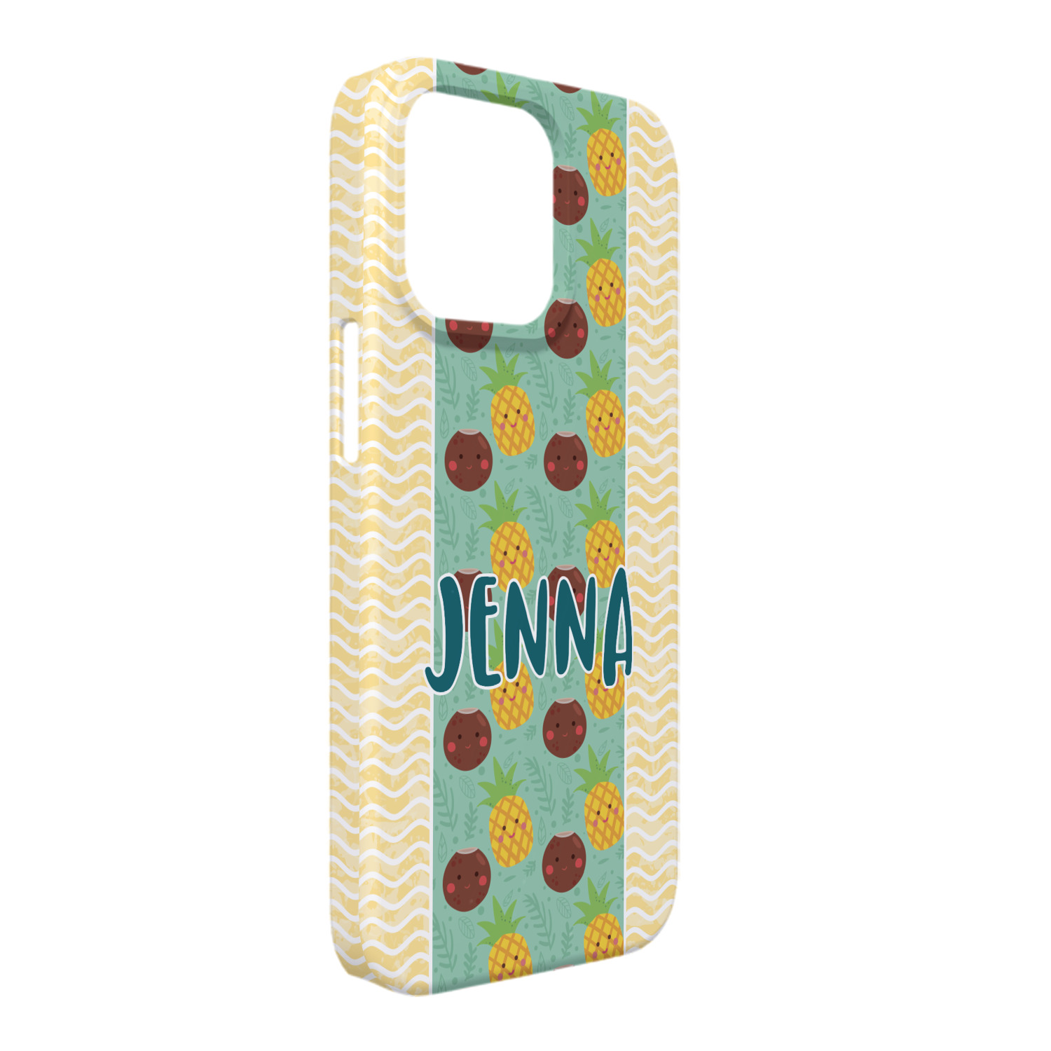 This design is filled with happy coconuts and pineapples to brighten your day. A nice teal color is used behind them, while a yellow chevron is used as the secondary pattern.
