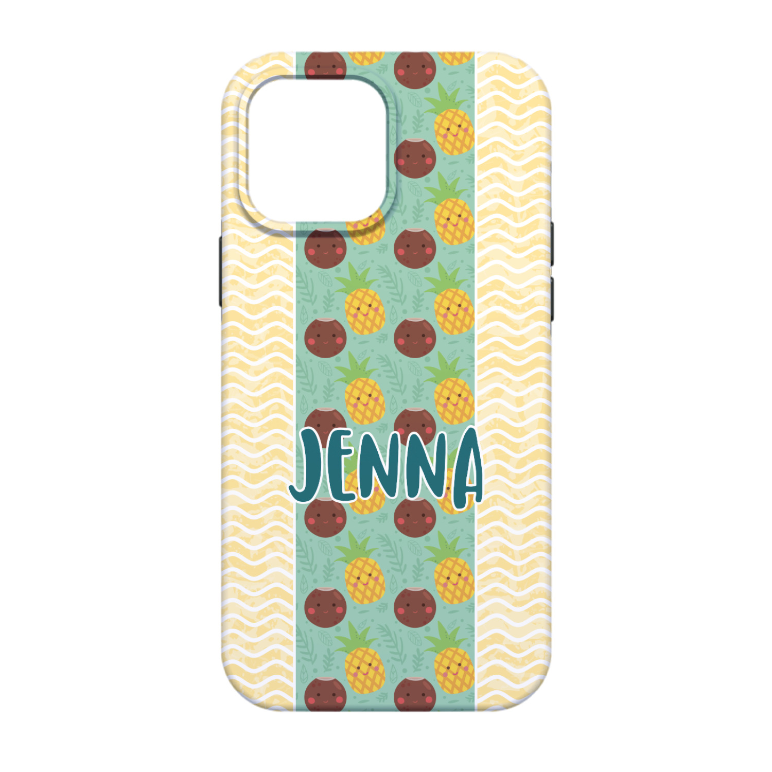 This design is filled with happy coconuts and pineapples to brighten your day. A nice teal color is used behind them, while a yellow chevron is used as the secondary pattern.