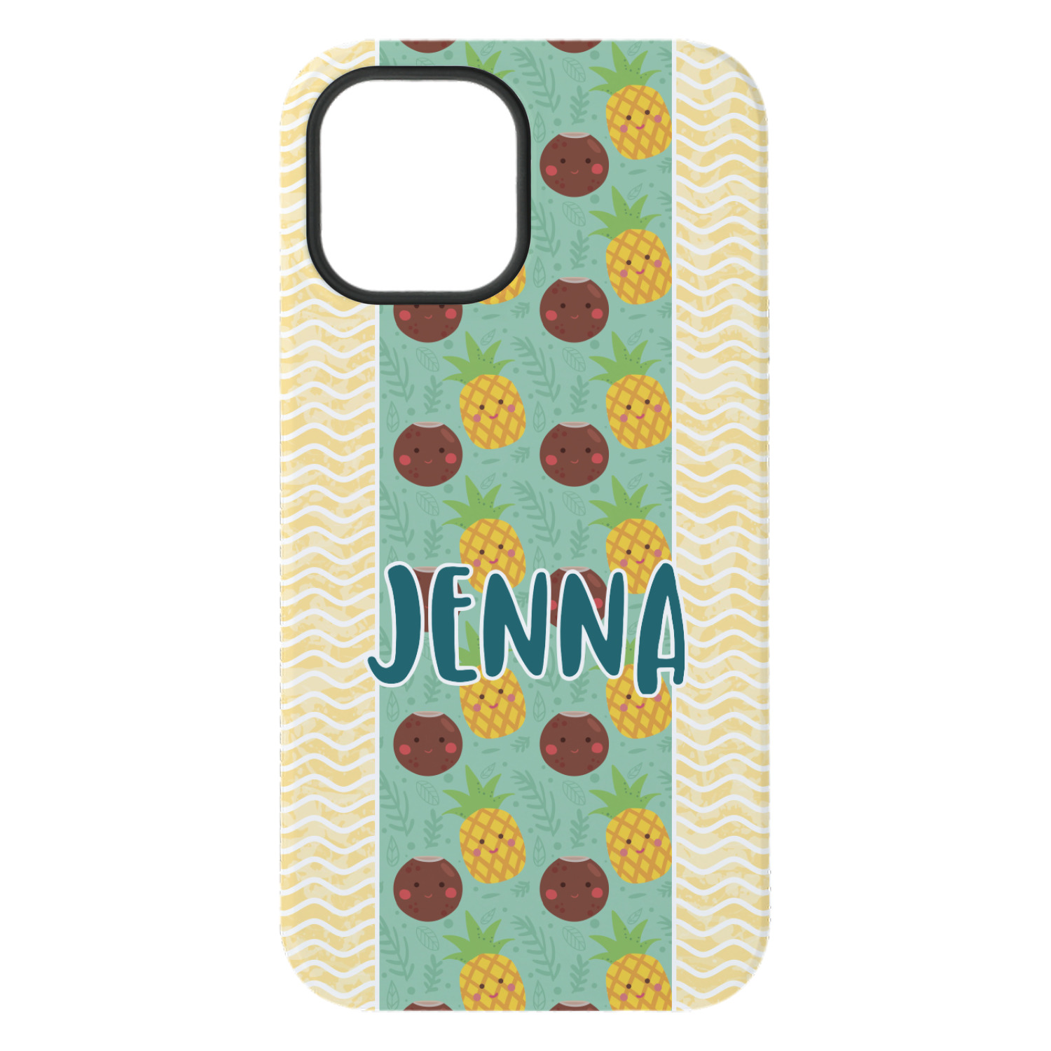 This design is filled with happy coconuts and pineapples to brighten your day. A nice teal color is used behind them, while a yellow chevron is used as the secondary pattern.