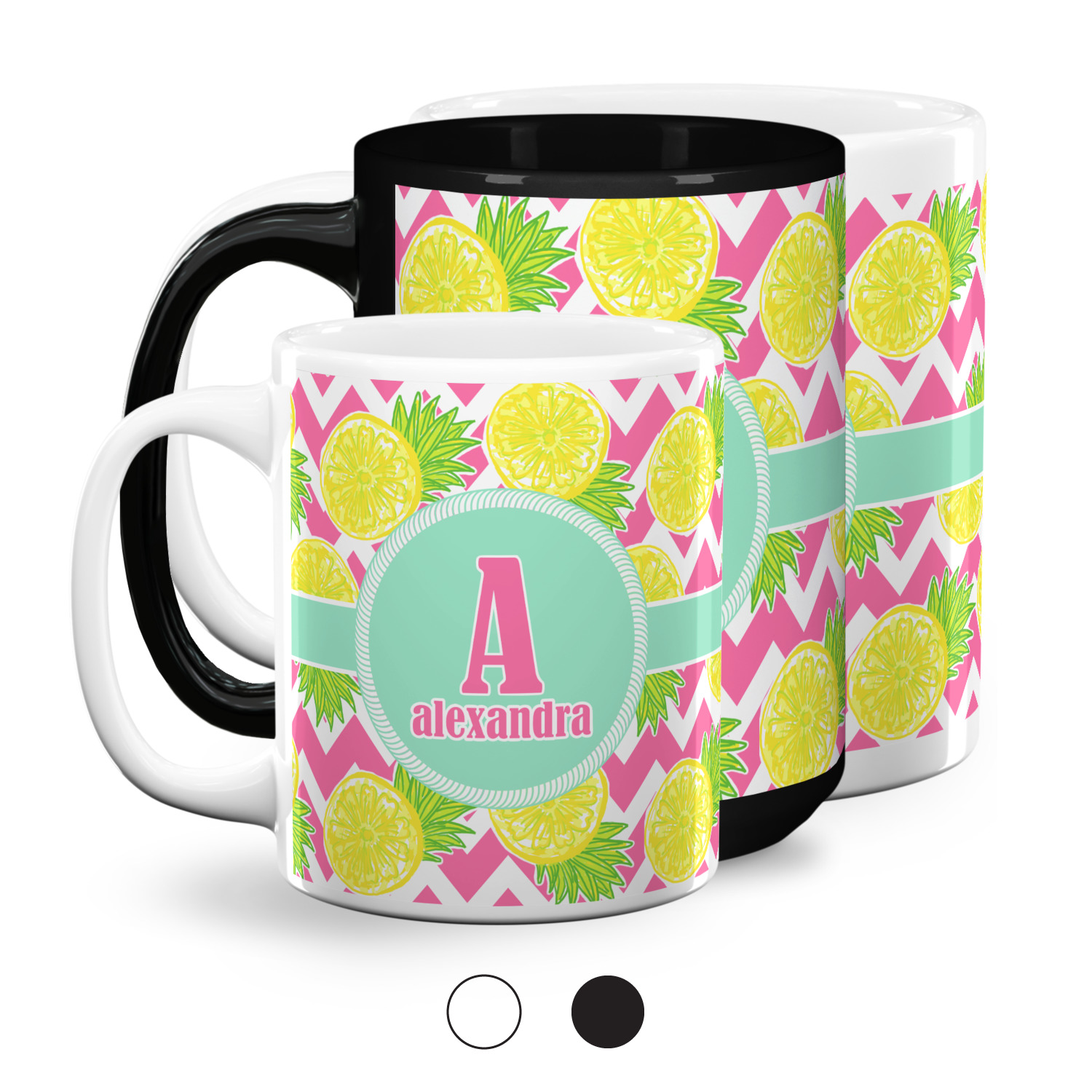 The main design has a background with bright pink and white chevron with some crazy yellow and lime pineapple slices scattered on top. A soft mint color is used for the ribbon and label, while a pink is used for the personalized name and initial.