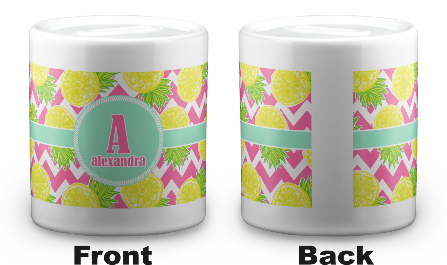 The main design has a background with bright pink and white chevron with some crazy yellow and lime pineapple slices scattered on top. A soft mint color is used for the ribbon and label, while a pink is used for the personalized name and initial.