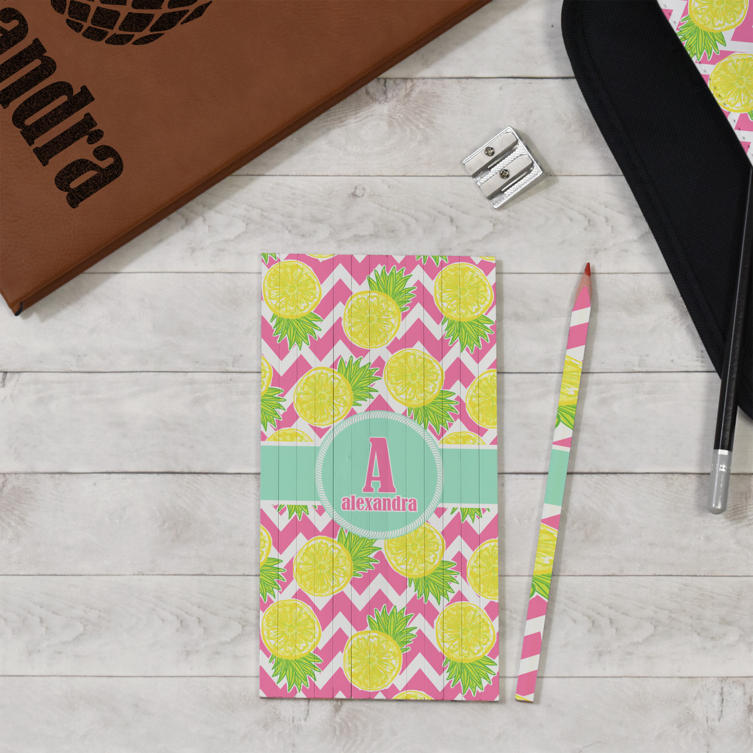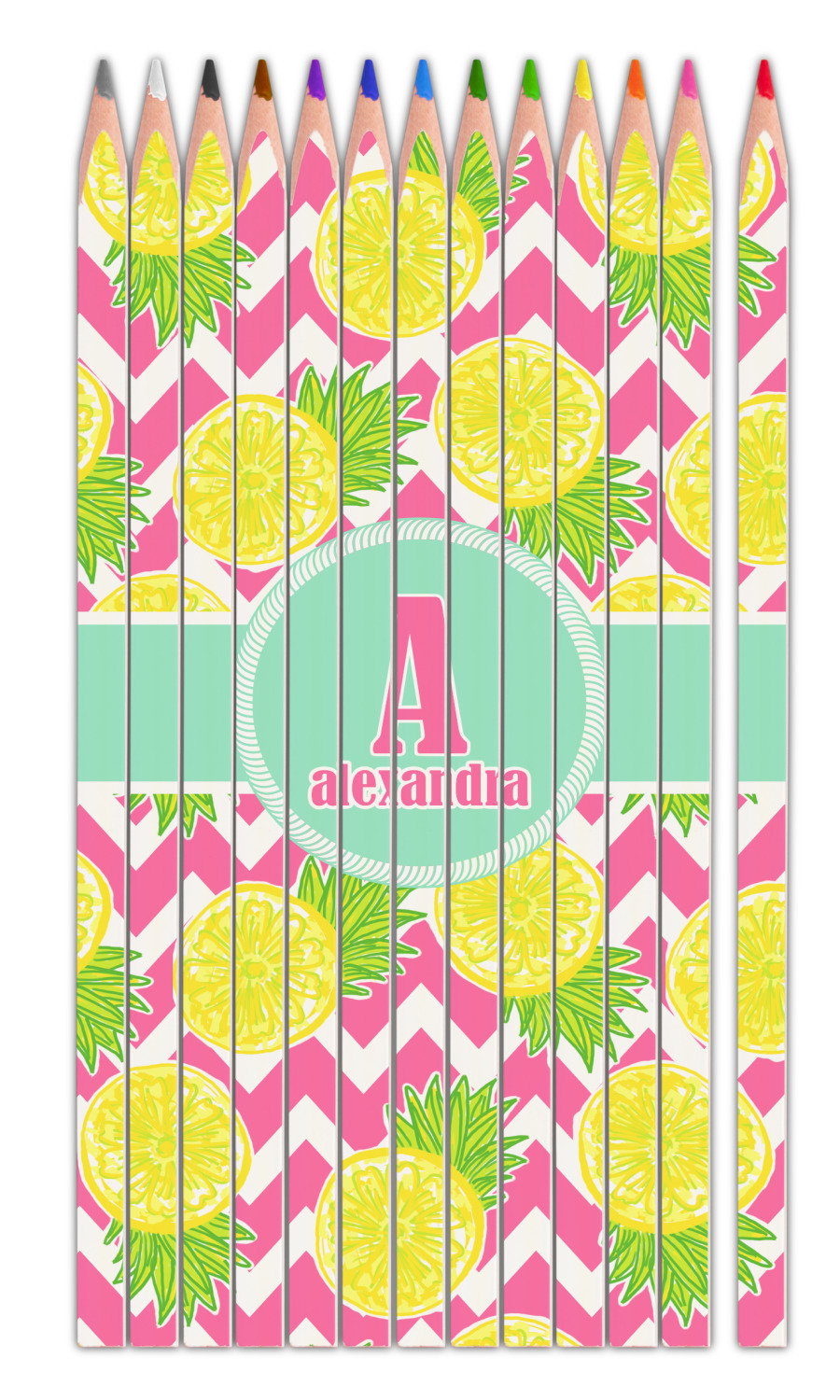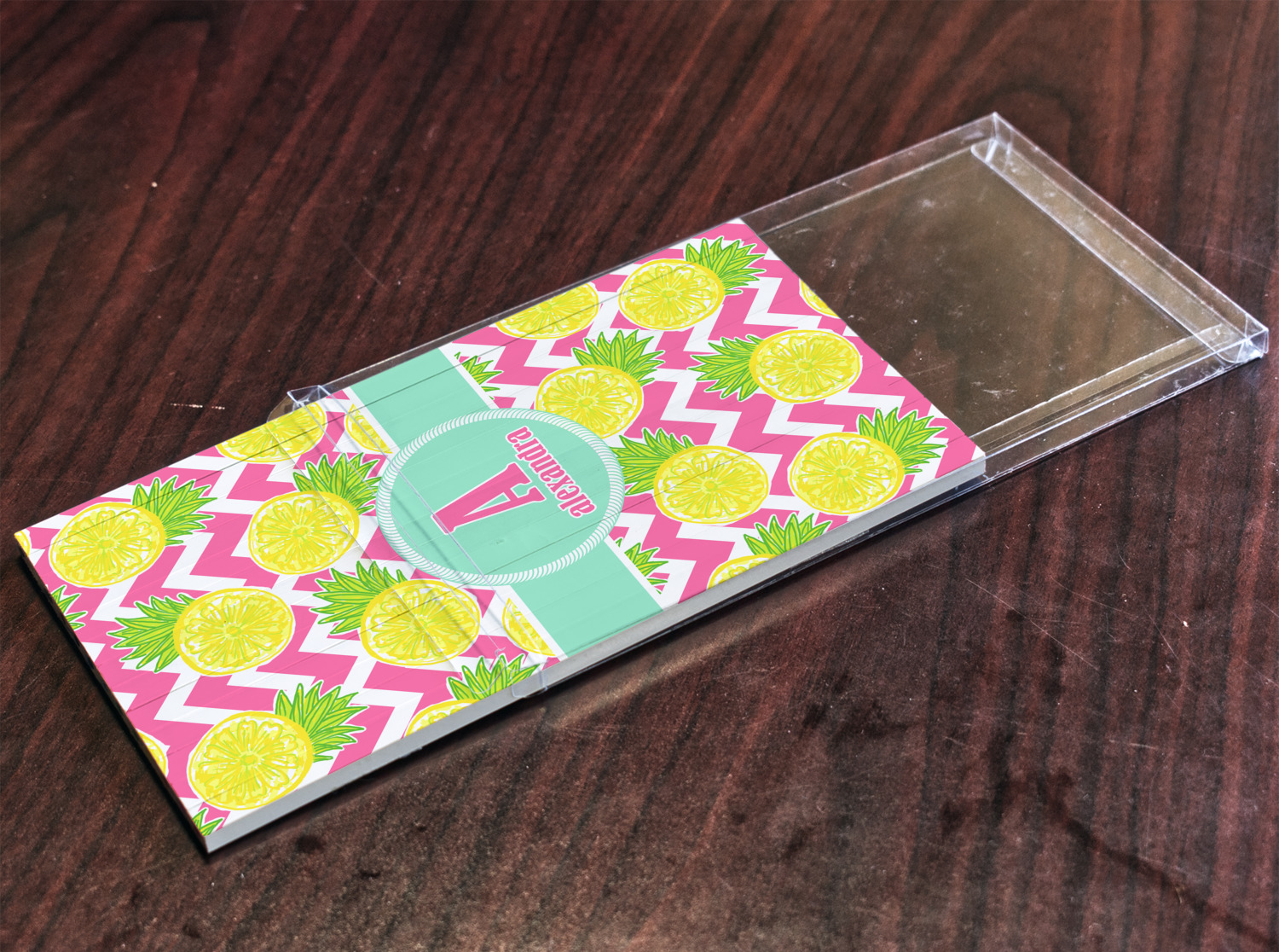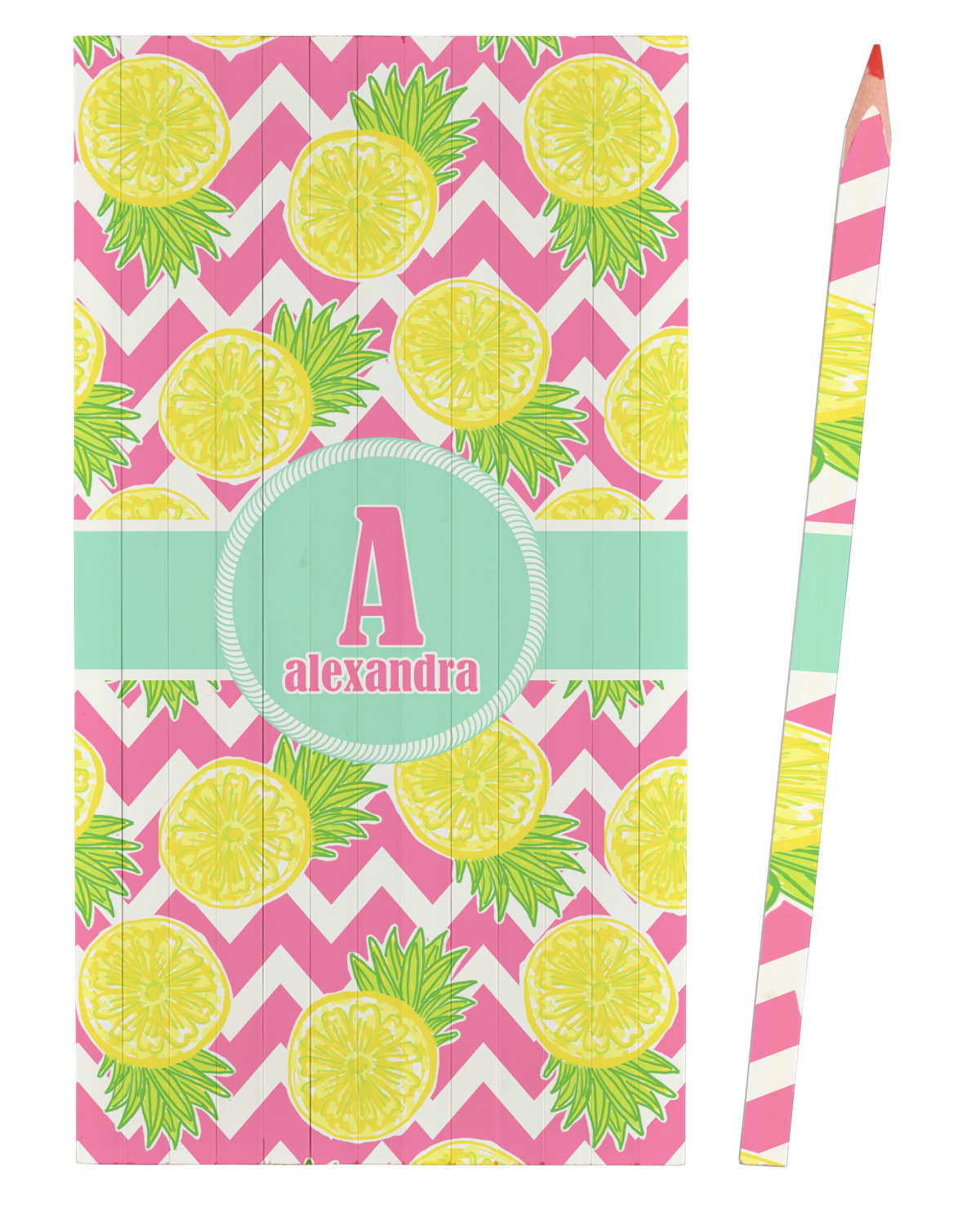 The main design has a background with bright pink and white chevron with some crazy yellow and lime pineapple slices scattered on top. A soft mint color is used for the ribbon and label, while a pink is used for the personalized name and initial.