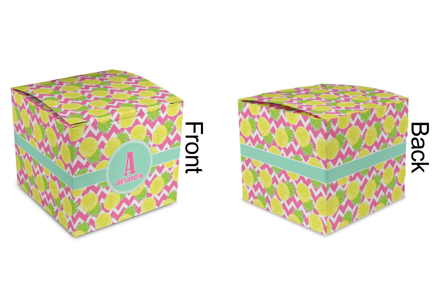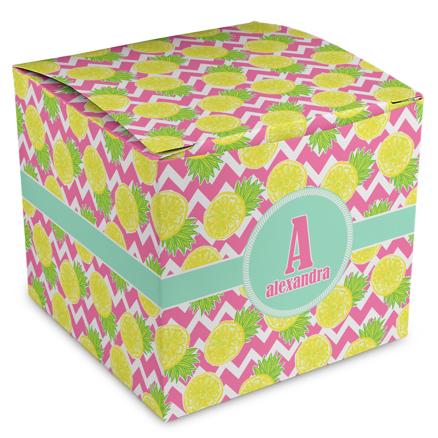 The main design has a background with bright pink and white chevron with some crazy yellow and lime pineapple slices scattered on top. A soft mint color is used for the ribbon and label, while a pink is used for the personalized name and initial.