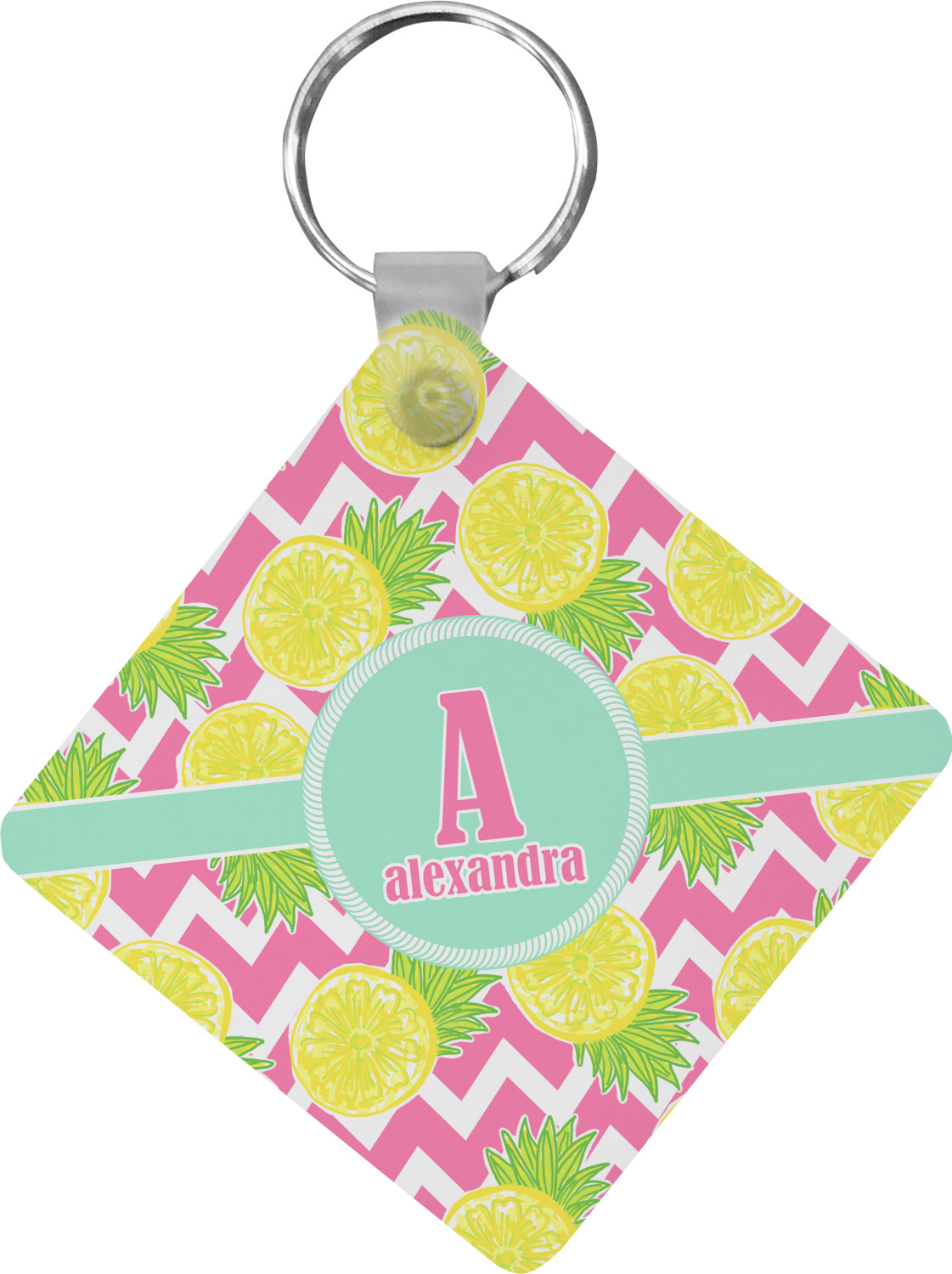 The main design has a background with bright pink and white chevron with some crazy yellow and lime pineapple slices scattered on top. A soft mint color is used for the ribbon and label, while a pink is used for the personalized name and initial.