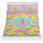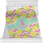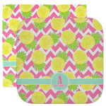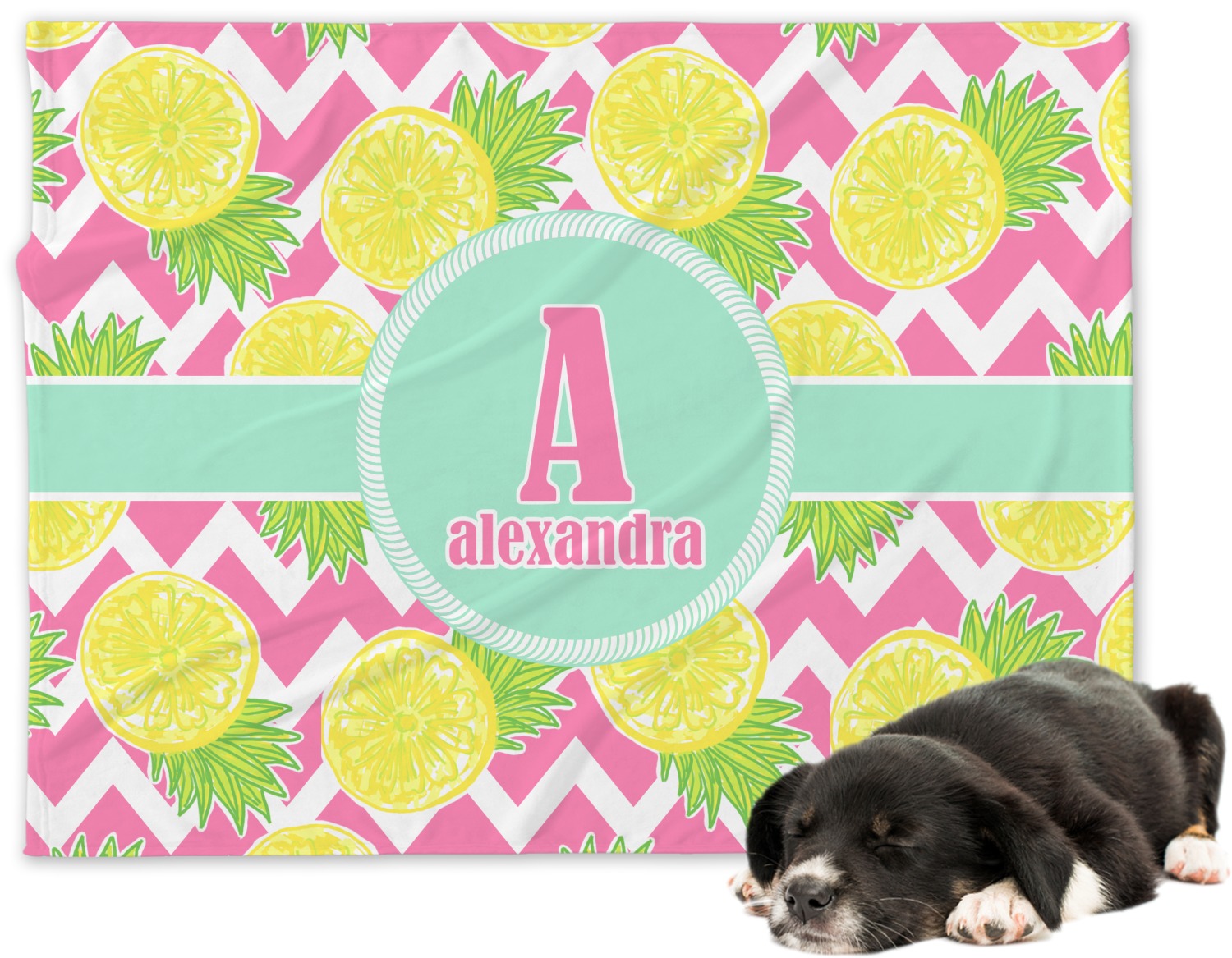 The main design has a background with bright pink and white chevron with some crazy yellow and lime pineapple slices scattered on top. A soft mint color is used for the ribbon and label, while a pink is used for the personalized name and initial.