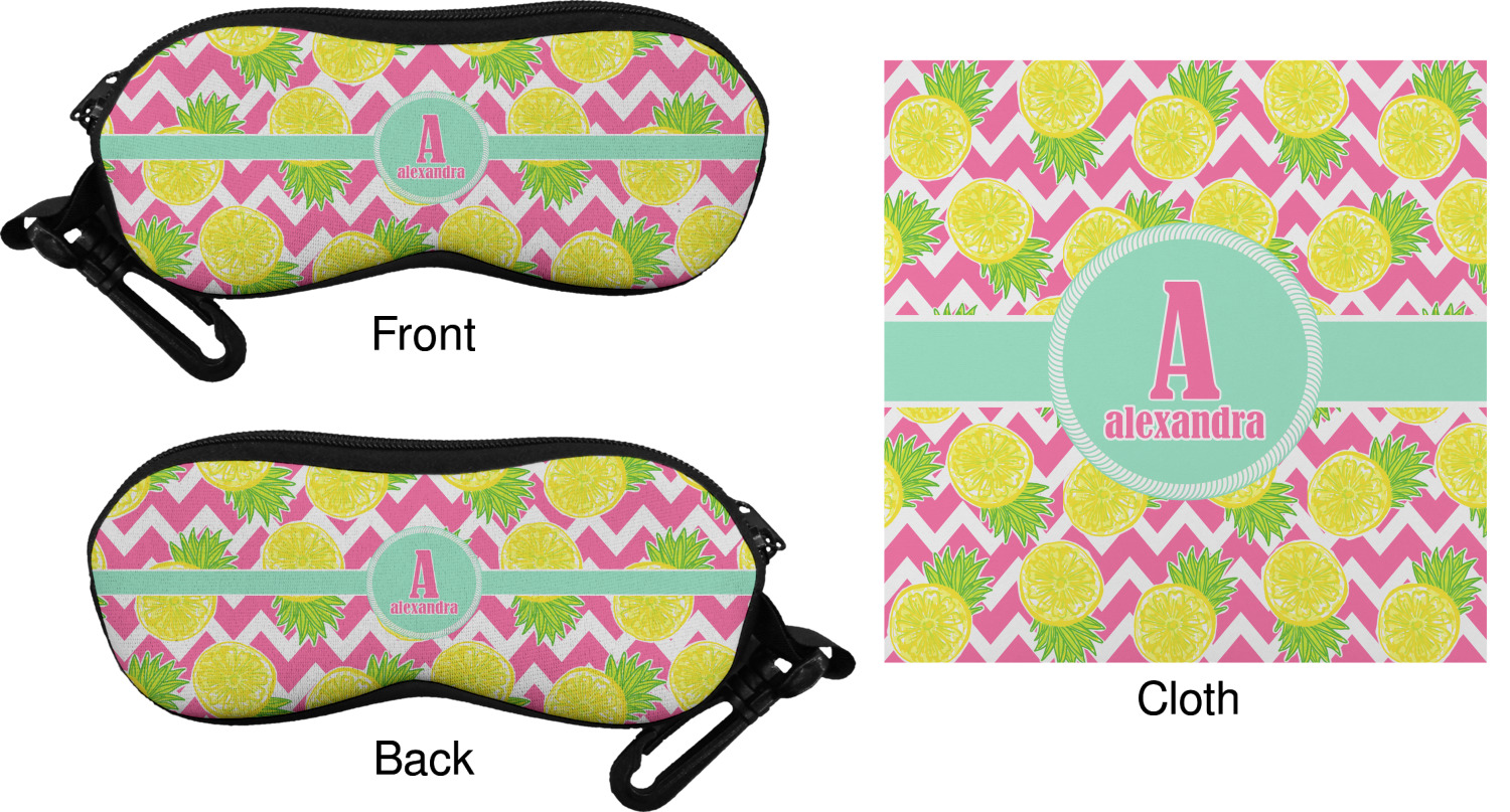The main design has a background with bright pink and white chevron with some crazy yellow and lime pineapple slices scattered on top. A soft mint color is used for the ribbon and label, while a pink is used for the personalized name and initial.