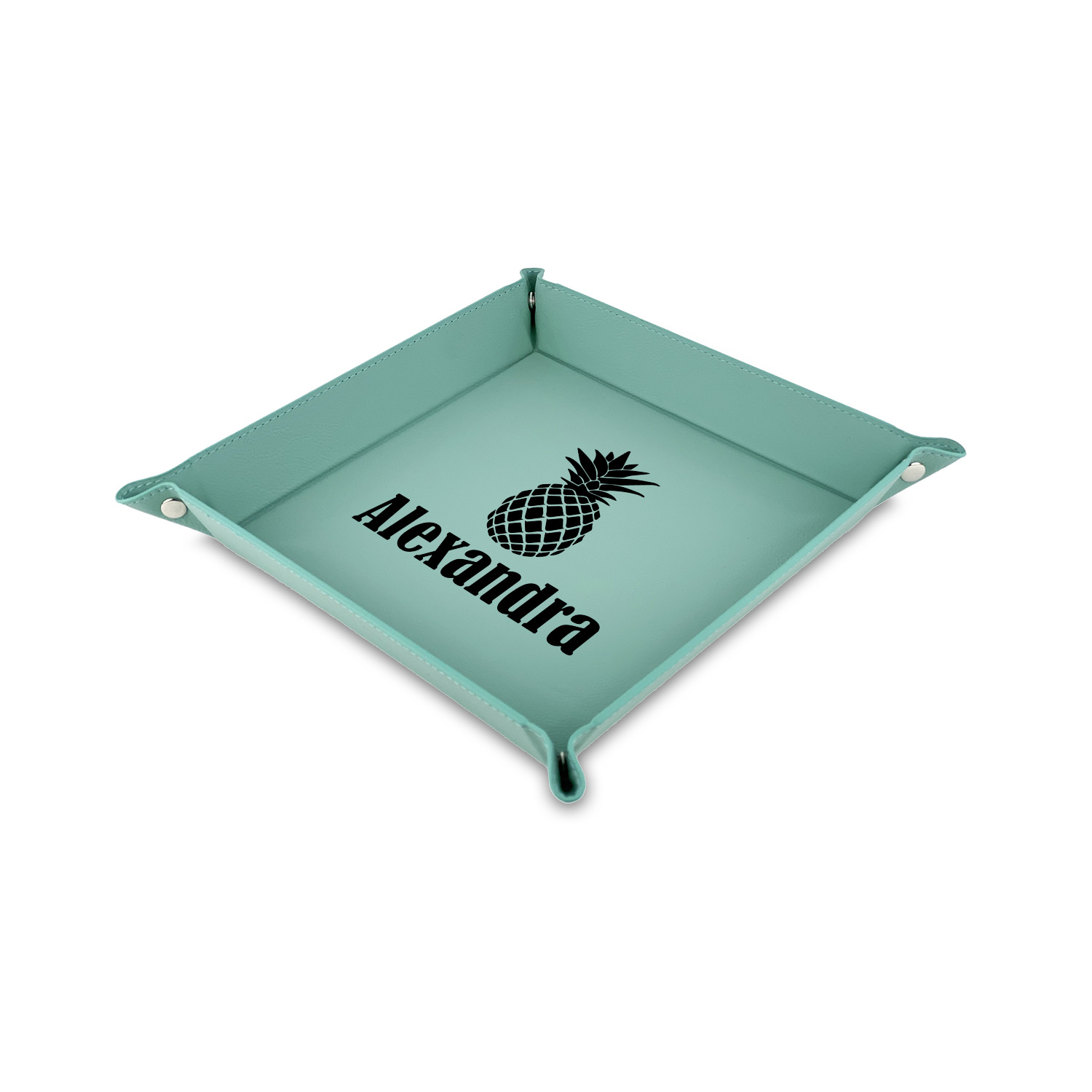 The coordinating design has a large, bright pineapple on the left side with a mint ribbon running behind it. On the right side of the ribbon is the personalized text. The background is a bright pink and white chevron. You are sure to be noticed with this bright design!