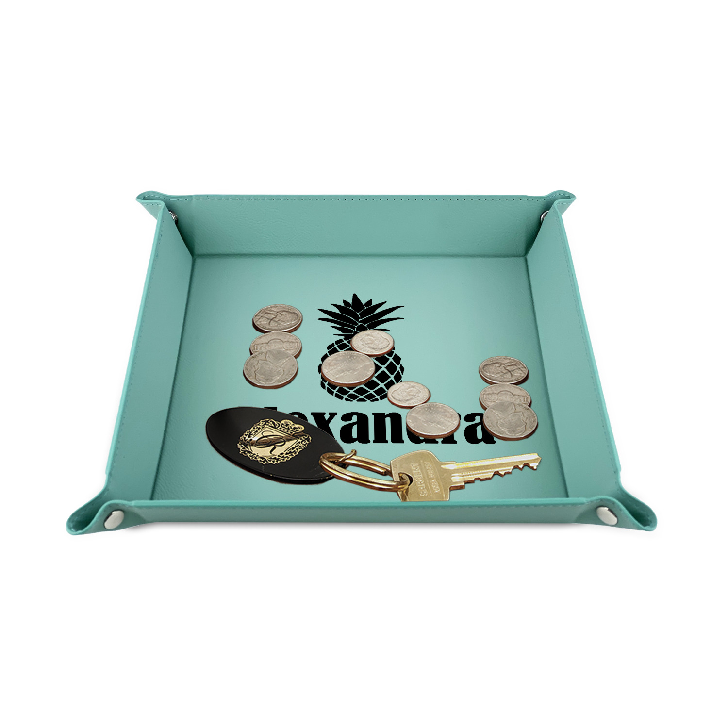 The leatherette wraps the hard board base and sides with flexible hinges to fold the sides up. The corners are secured using silver snaps. The 6in x 6 in tray measures approximately 9.5in x 9.5in when laid flat. The 9in x 9in tray measures approximately 13in x 13in when laid flat.