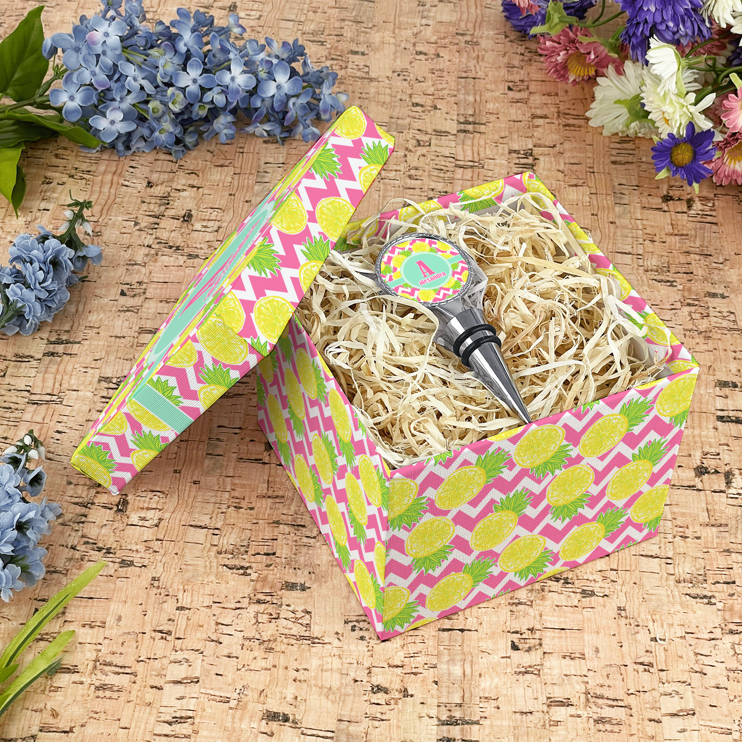 The main design has a background with bright pink and white chevron with some crazy yellow and lime pineapple slices scattered on top. A soft mint color is used for the ribbon and label, while a pink is used for the personalized name and initial.