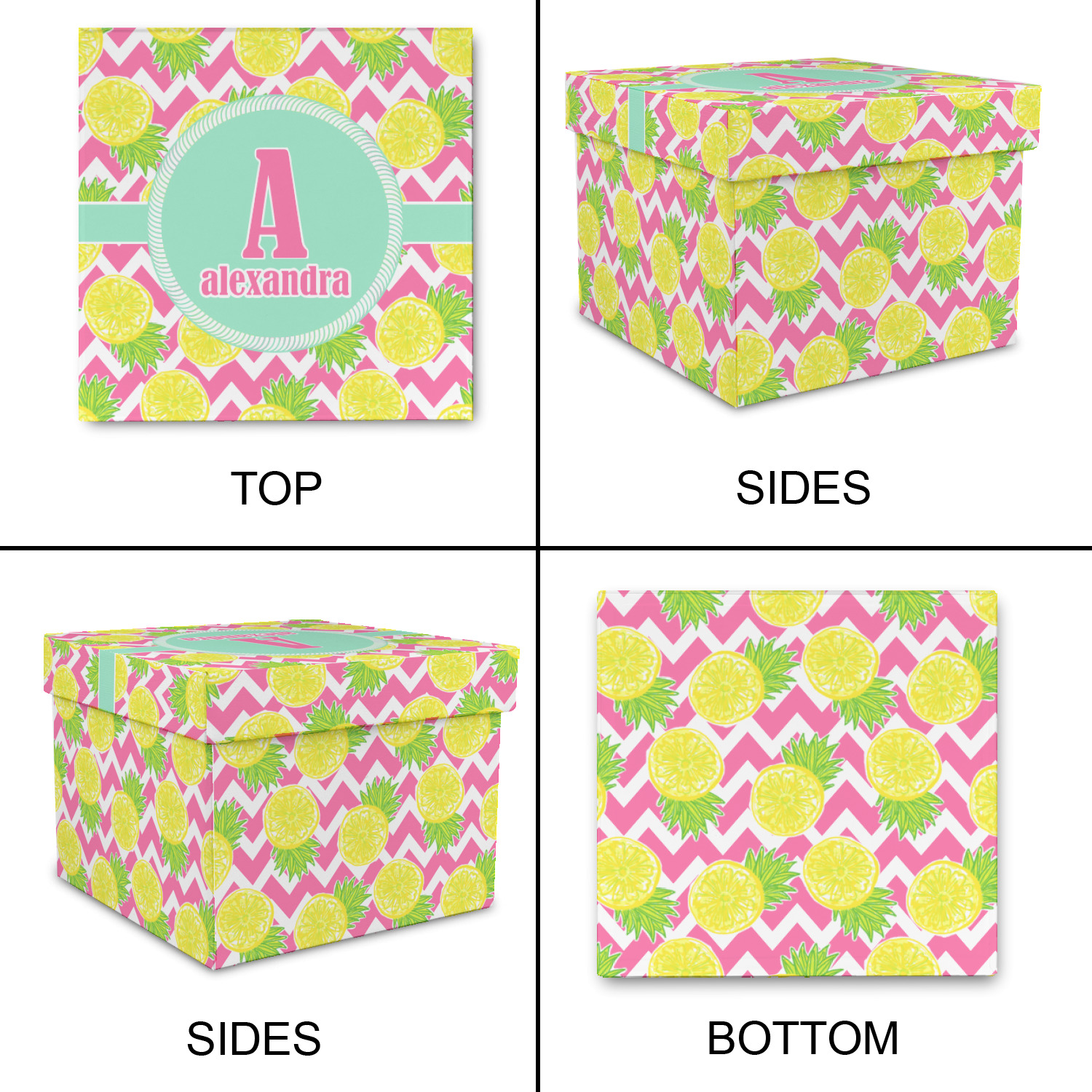 The main design has a background with bright pink and white chevron with some crazy yellow and lime pineapple slices scattered on top. A soft mint color is used for the ribbon and label, while a pink is used for the personalized name and initial.
