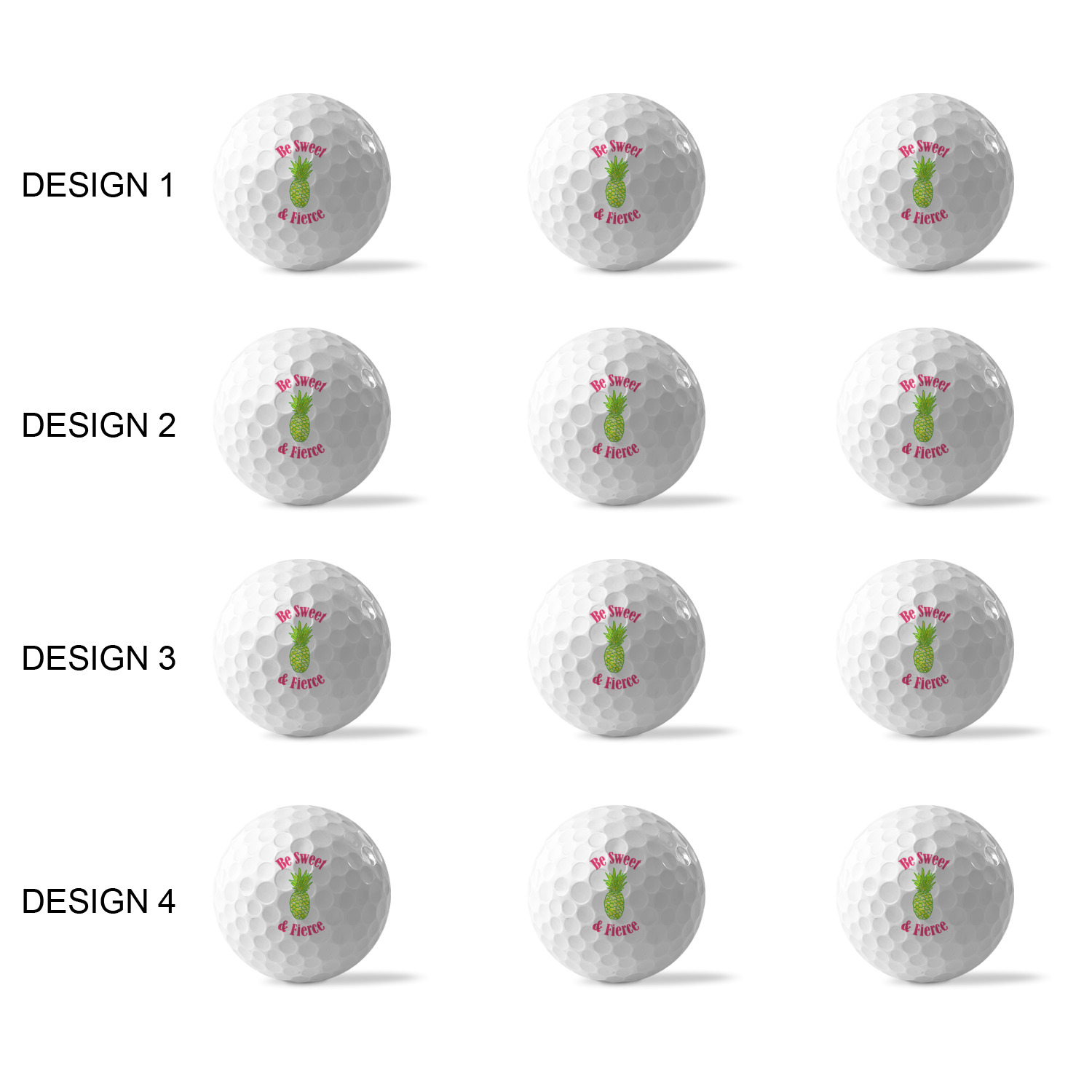 Printed in a 7/8" circle on each ball, you can customize these with our design studio or use your own designs. For a set of 3 you can design each one individually, for a set of 12 you will be able to use 4 unique designs and will receive 3 balls with each design.