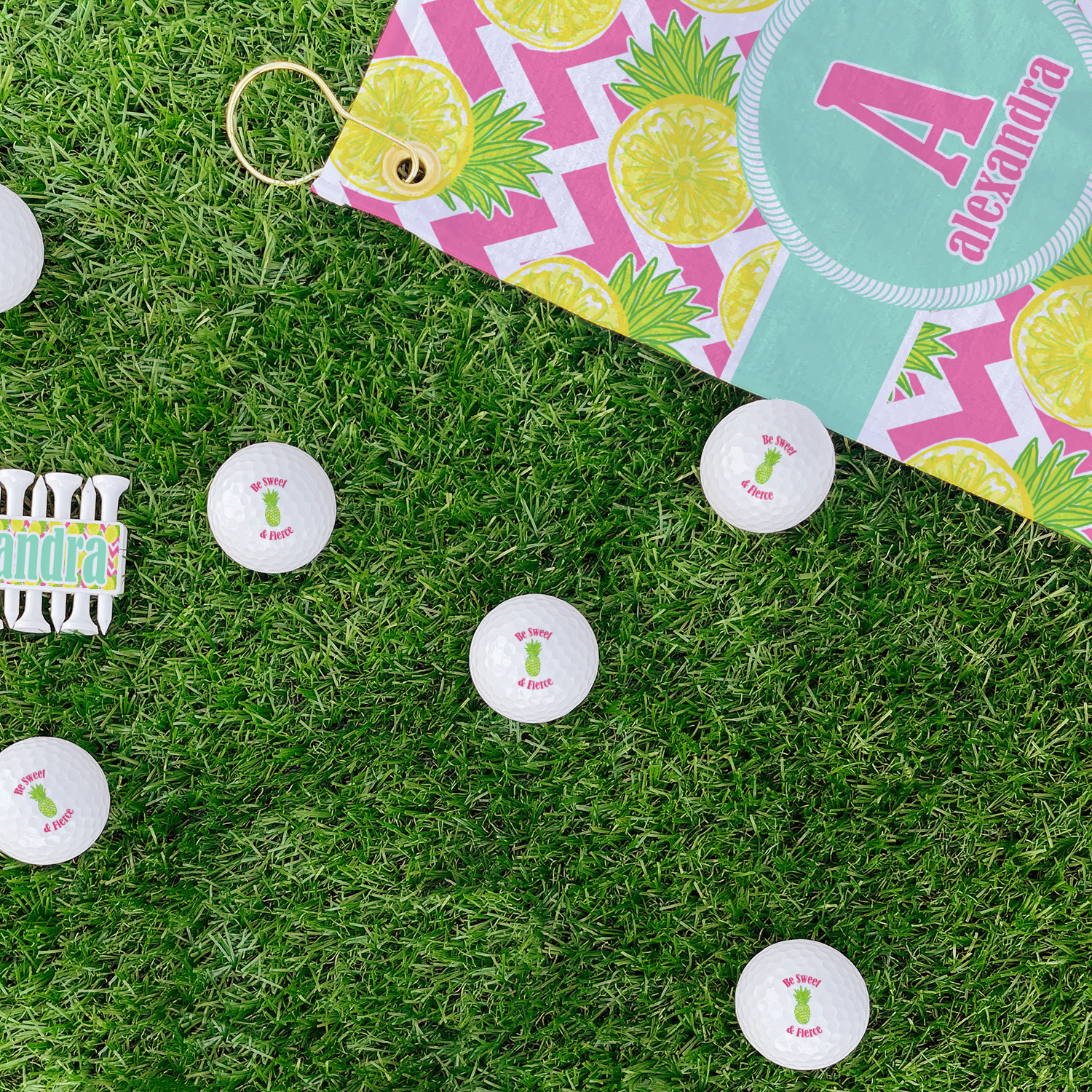 The main design has a background with bright pink and white chevron with some crazy yellow and lime pineapple slices scattered on top. A soft mint color is used for the ribbon and label, while a pink is used for the personalized name and initial.
