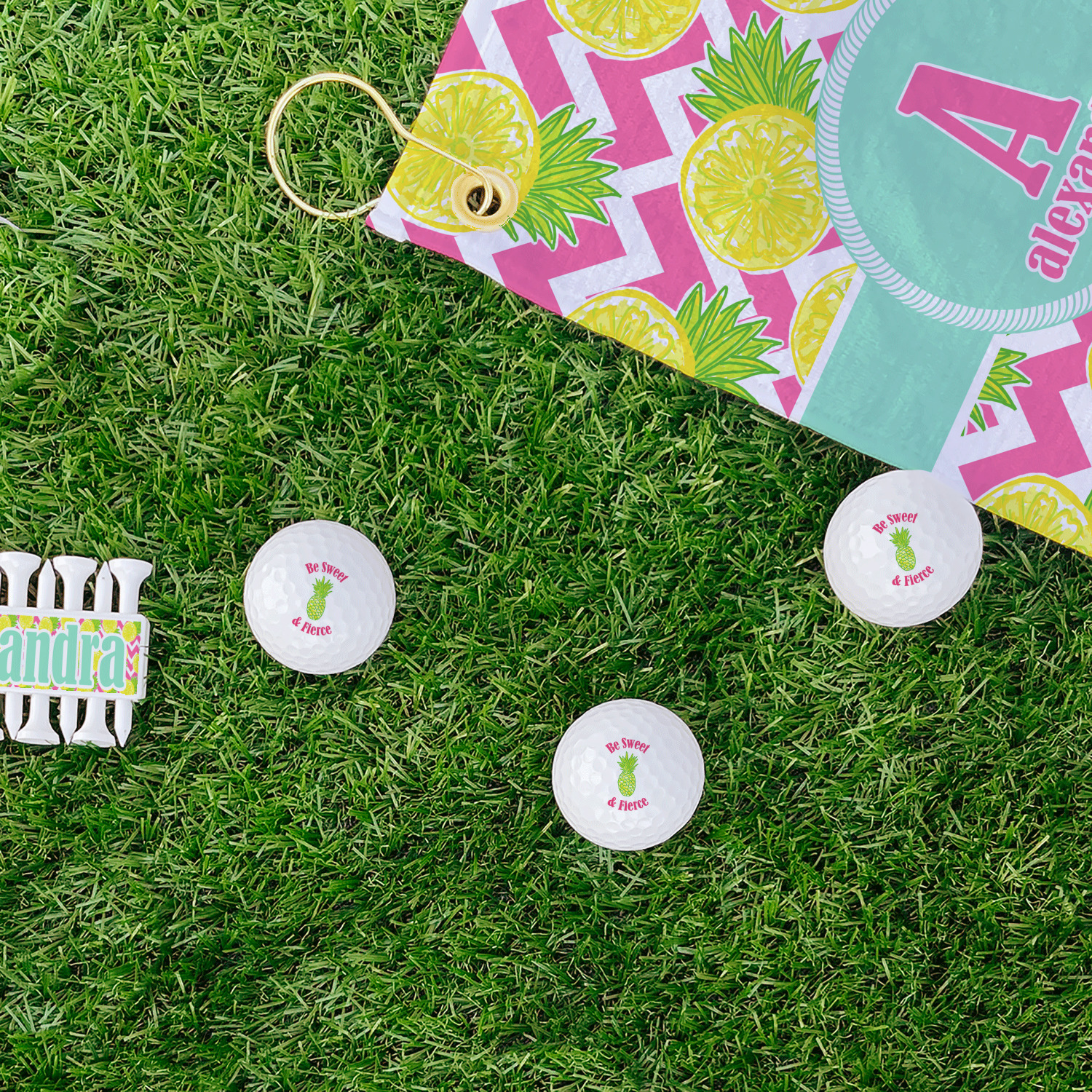 The main design has a background with bright pink and white chevron with some crazy yellow and lime pineapple slices scattered on top. A soft mint color is used for the ribbon and label, while a pink is used for the personalized name and initial.