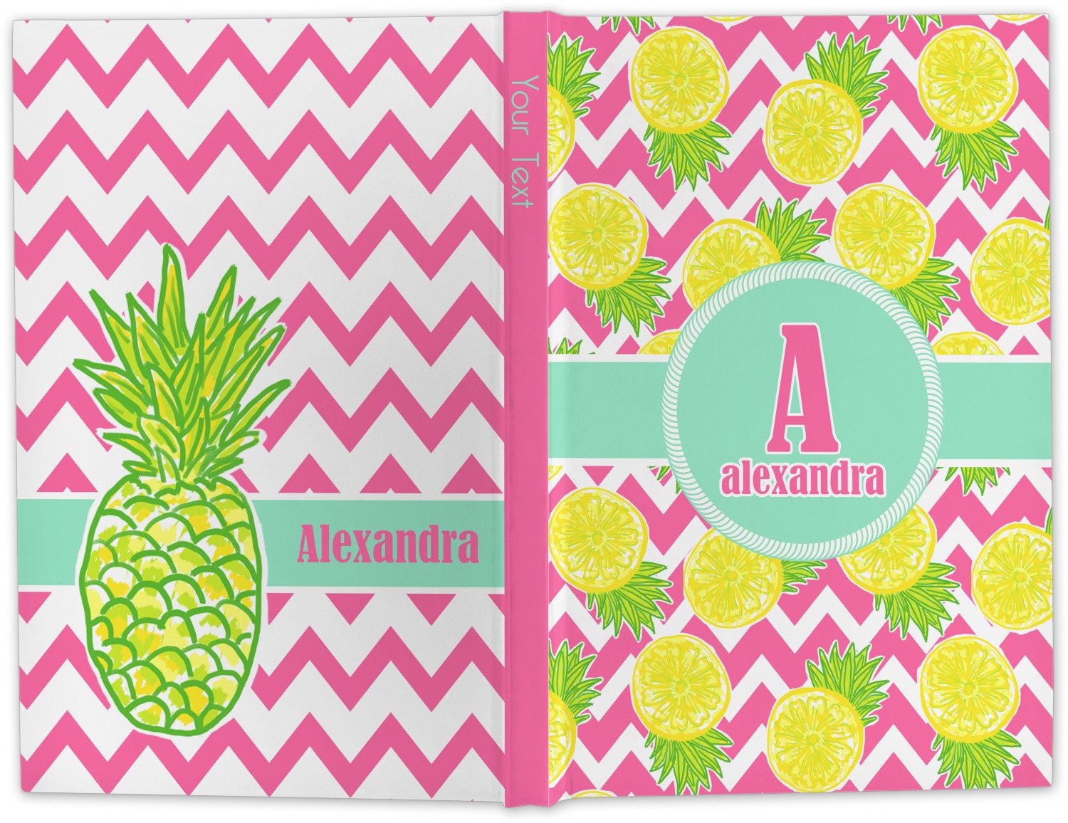 The main design has a background with bright pink and white chevron with some crazy yellow and lime pineapple slices scattered on top. A soft mint color is used for the ribbon and label, while a pink is used for the personalized name and initial.