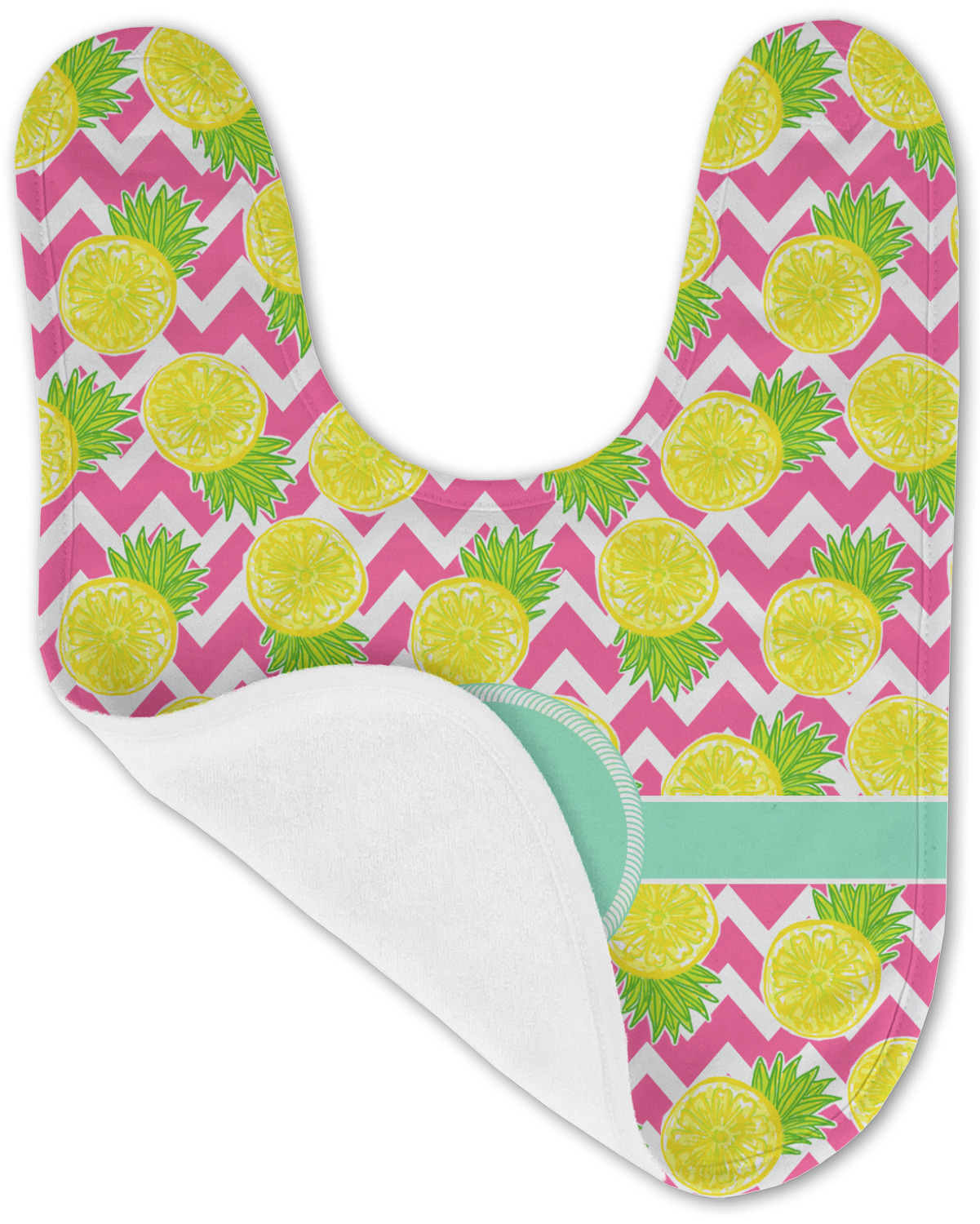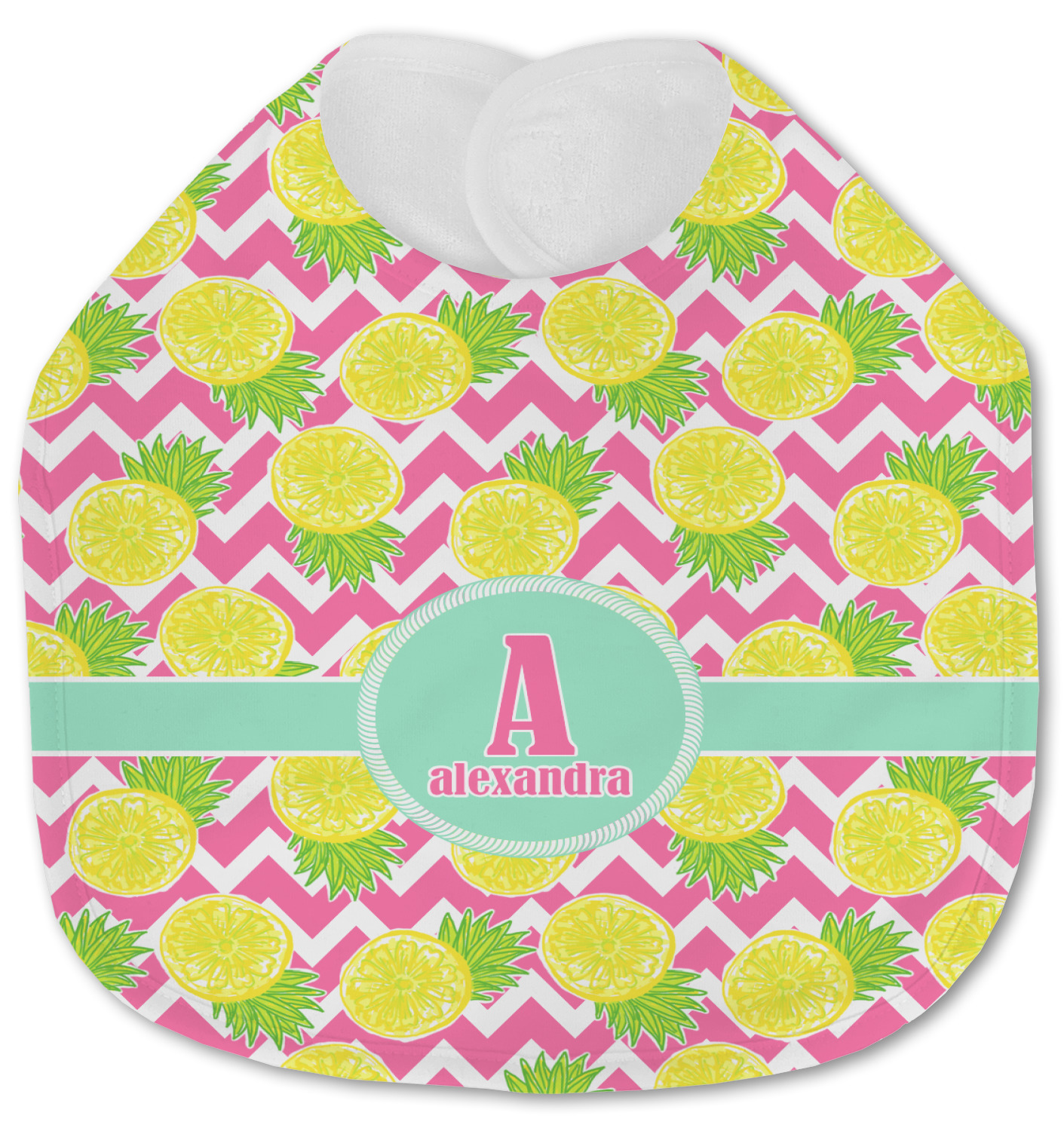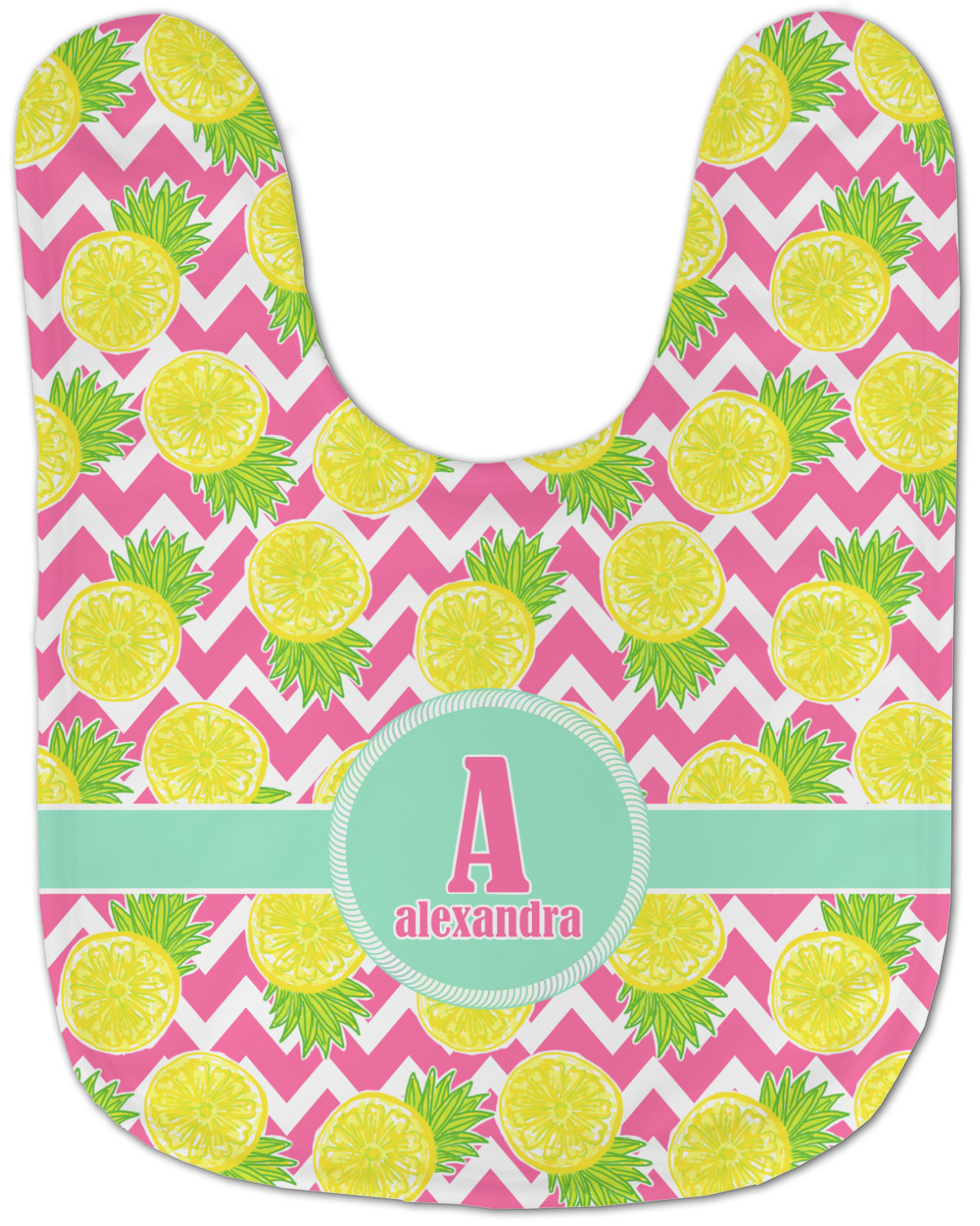 The main design has a background with bright pink and white chevron with some crazy yellow and lime pineapple slices scattered on top. A soft mint color is used for the ribbon and label, while a pink is used for the personalized name and initial.
