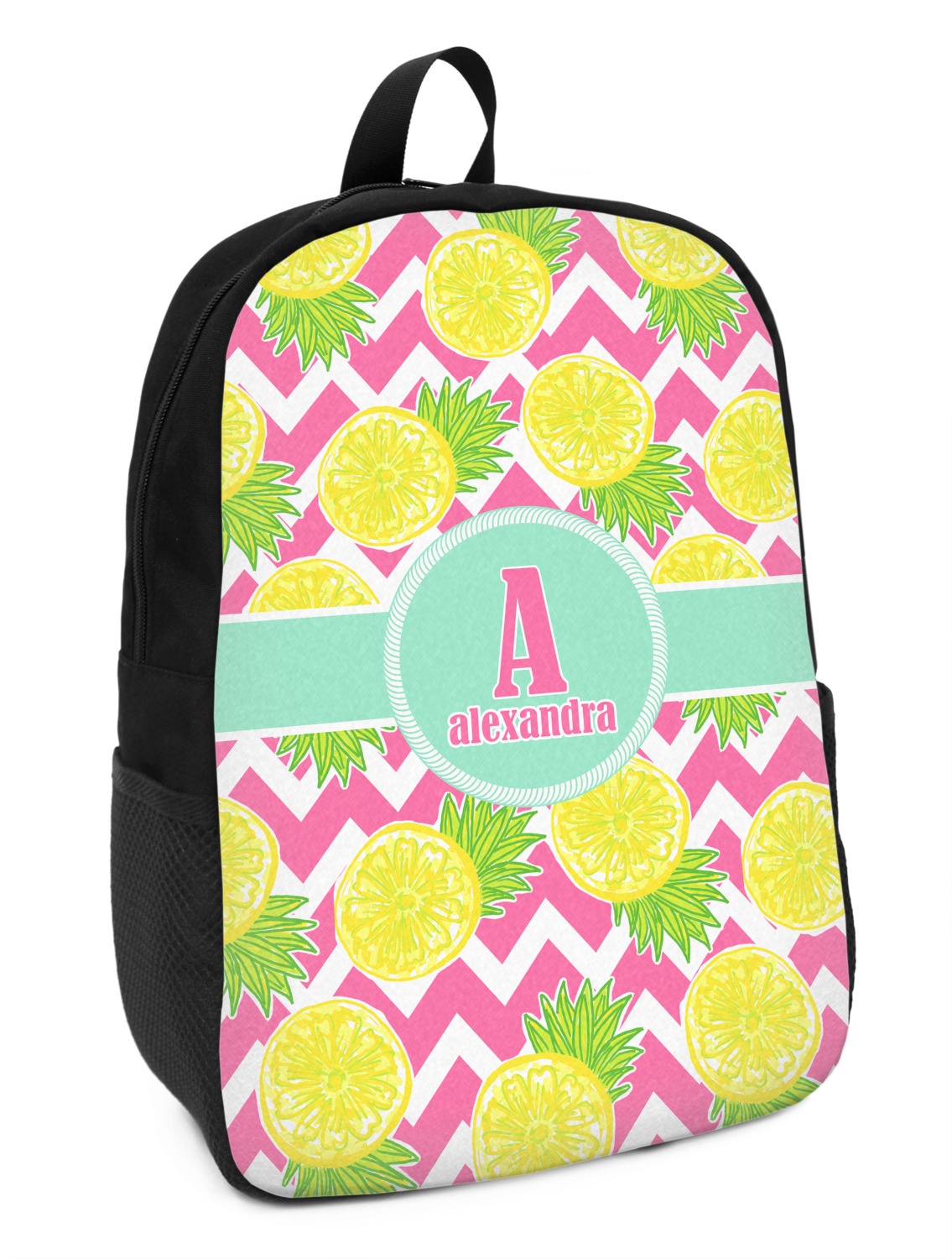 The main design has a background with bright pink and white chevron with some crazy yellow and lime pineapple slices scattered on top. A soft mint color is used for the ribbon and label, while a pink is used for the personalized name and initial.