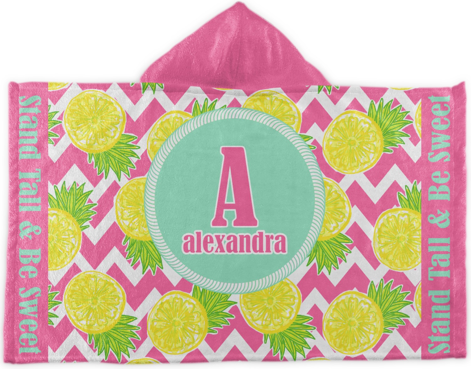 The main design has a background with bright pink and white chevron with some crazy yellow and lime pineapple slices scattered on top. A soft mint color is used for the ribbon and label, while a pink is used for the personalized name and initial.