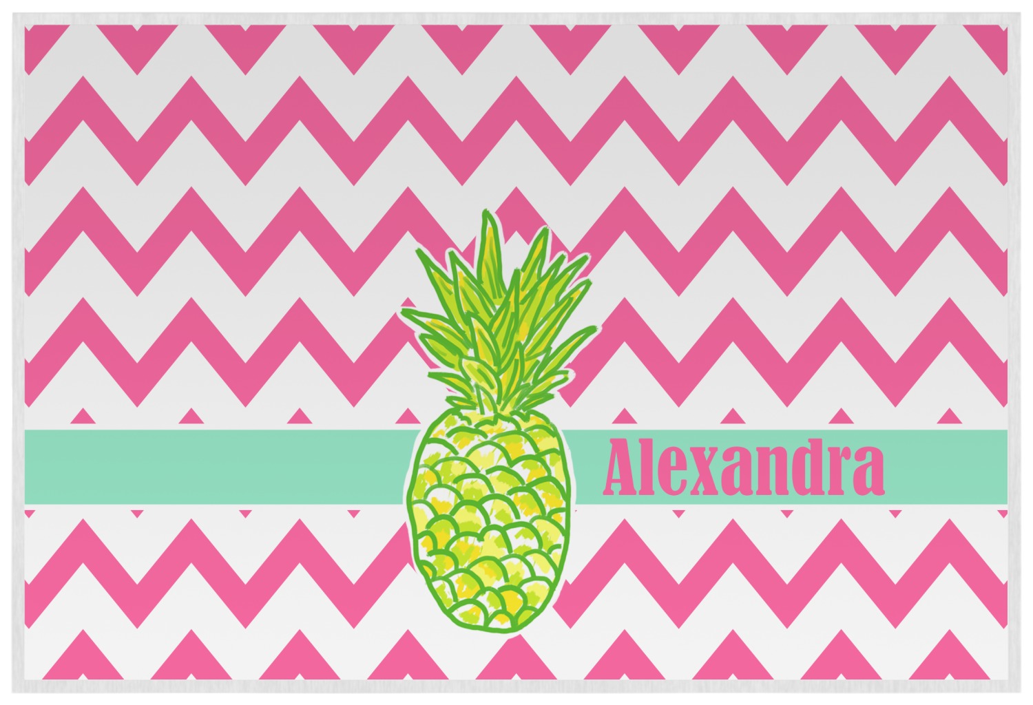 The coordinating design has a large, bright pineapple on the left side with a mint ribbon running behind it. On the right side of the ribbon is the personalized text. The background is a bright pink and white chevron. You are sure to be noticed with this bright design!