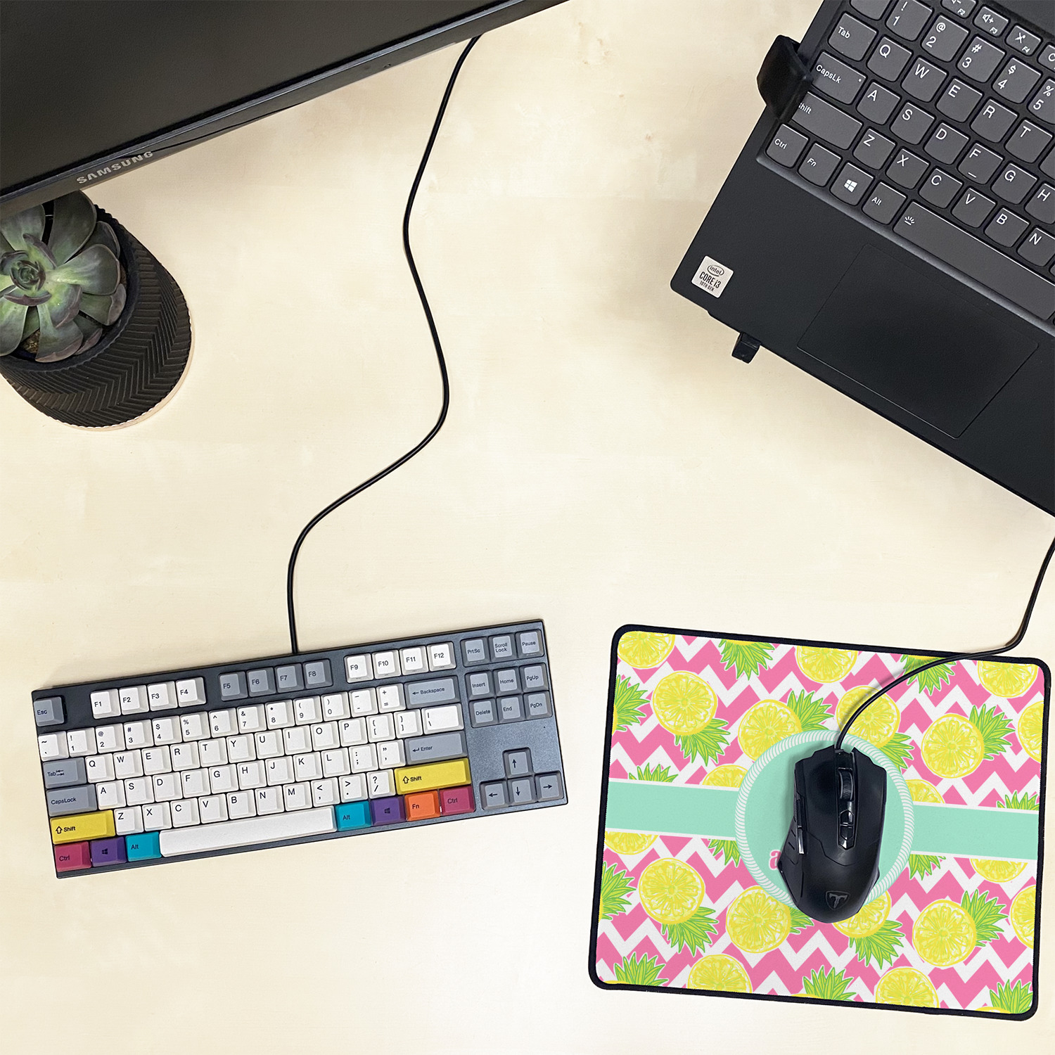 The main design has a background with bright pink and white chevron with some crazy yellow and lime pineapple slices scattered on top. A soft mint color is used for the ribbon and label, while a pink is used for the personalized name and initial.