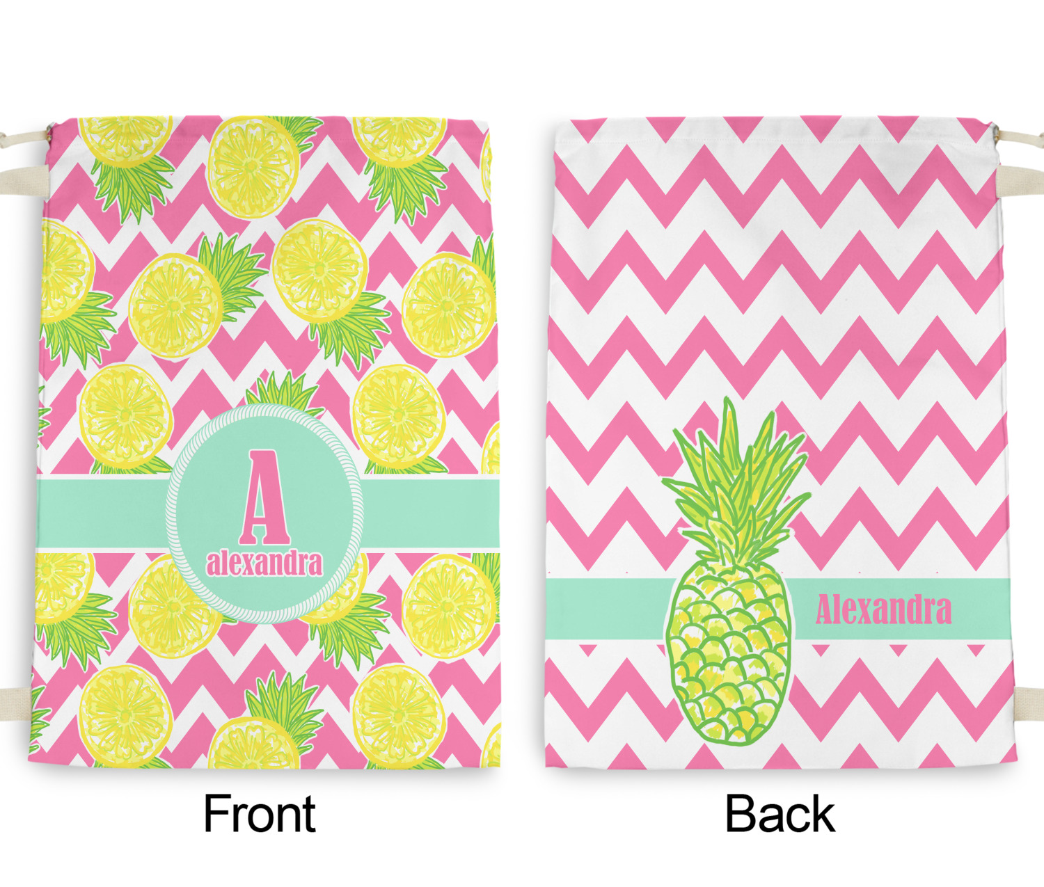 The main design has a background with bright pink and white chevron with some crazy yellow and lime pineapple slices scattered on top. A soft mint color is used for the ribbon and label, while a pink is used for the personalized name and initial.