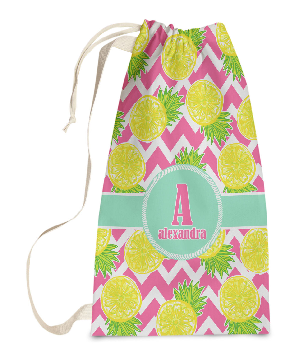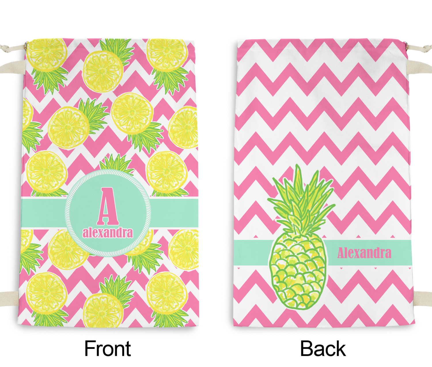 The main design has a background with bright pink and white chevron with some crazy yellow and lime pineapple slices scattered on top. A soft mint color is used for the ribbon and label, while a pink is used for the personalized name and initial.