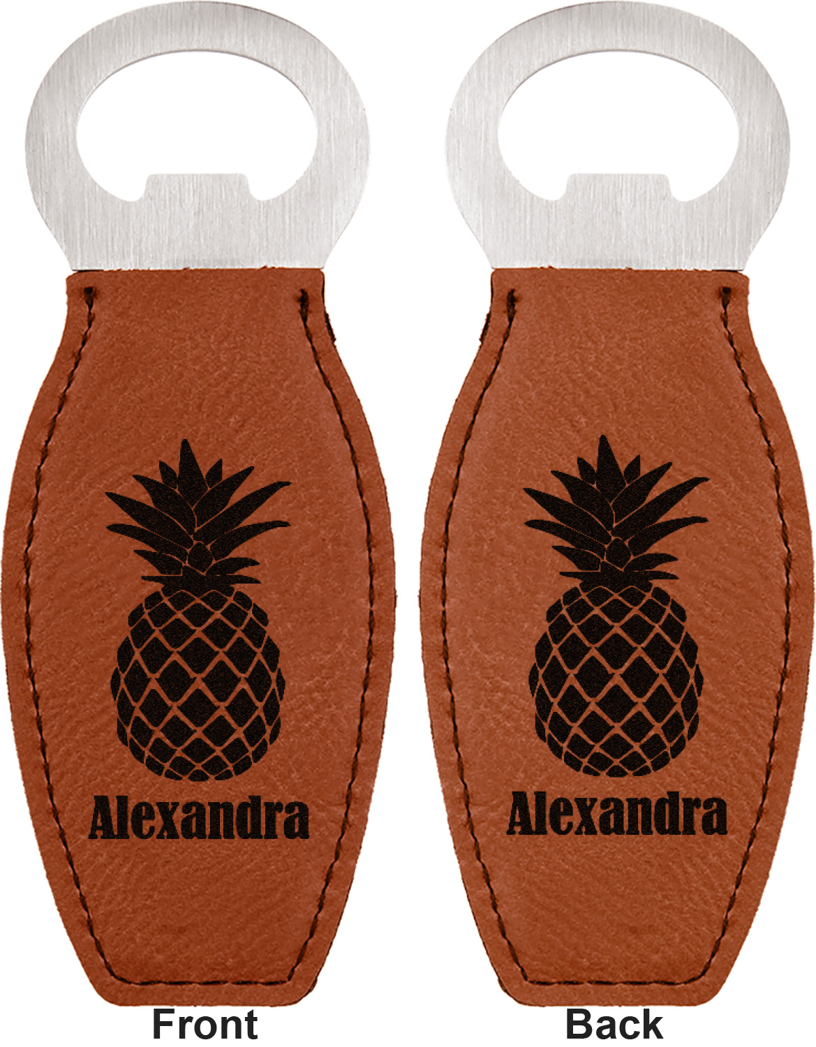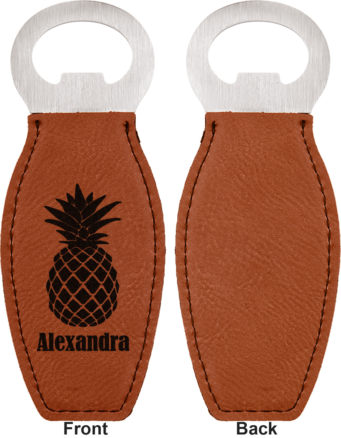 Built from stainless steel, these custom bottle openers are wrapped in a cognac-colored leatherette. Sharp, black stitching lines the edges for extra durability and a finished touch. Your personalization is laser-engraved onto the surface of this leatherette, leaving behind a crisp, black coloration. At 4.6 by 1.8 inches, this beer bottle opener gives you much of leverage when trying to open a stubborn bottle. On the opposite end of the opener, you'll find a magnet that you can use to display your new, unique bottle opener!