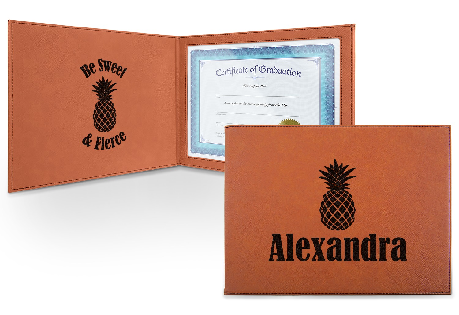 This cognac-colored, leatherette certificate jacket is the ideal way to display or store your hard-earned certificate. When closed, the custom certificate holder measures at 12 by 9 inches. The interior of the certificate cover includes a clear, vinyl window to encase your diploma. The window measures at around 10.5 by 7.5 inches and can accommodate a diploma that measures at up to 8.5 by 11 inches. You can either choose to have your customization laser engraved on the front and interior, or solely the front.