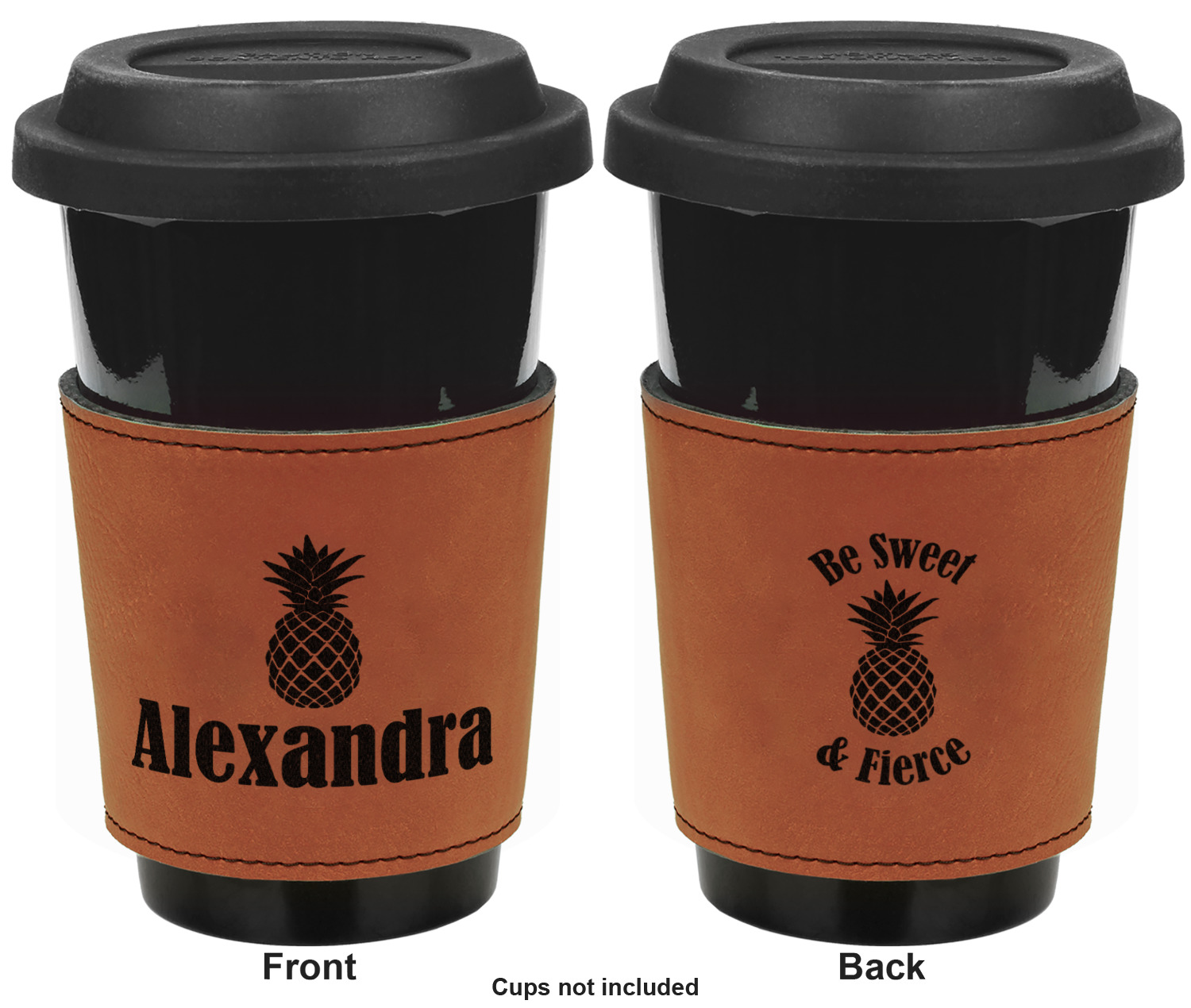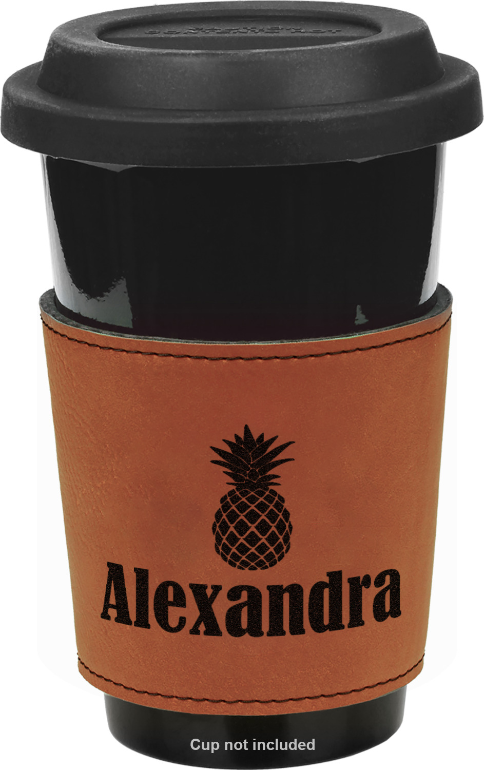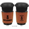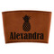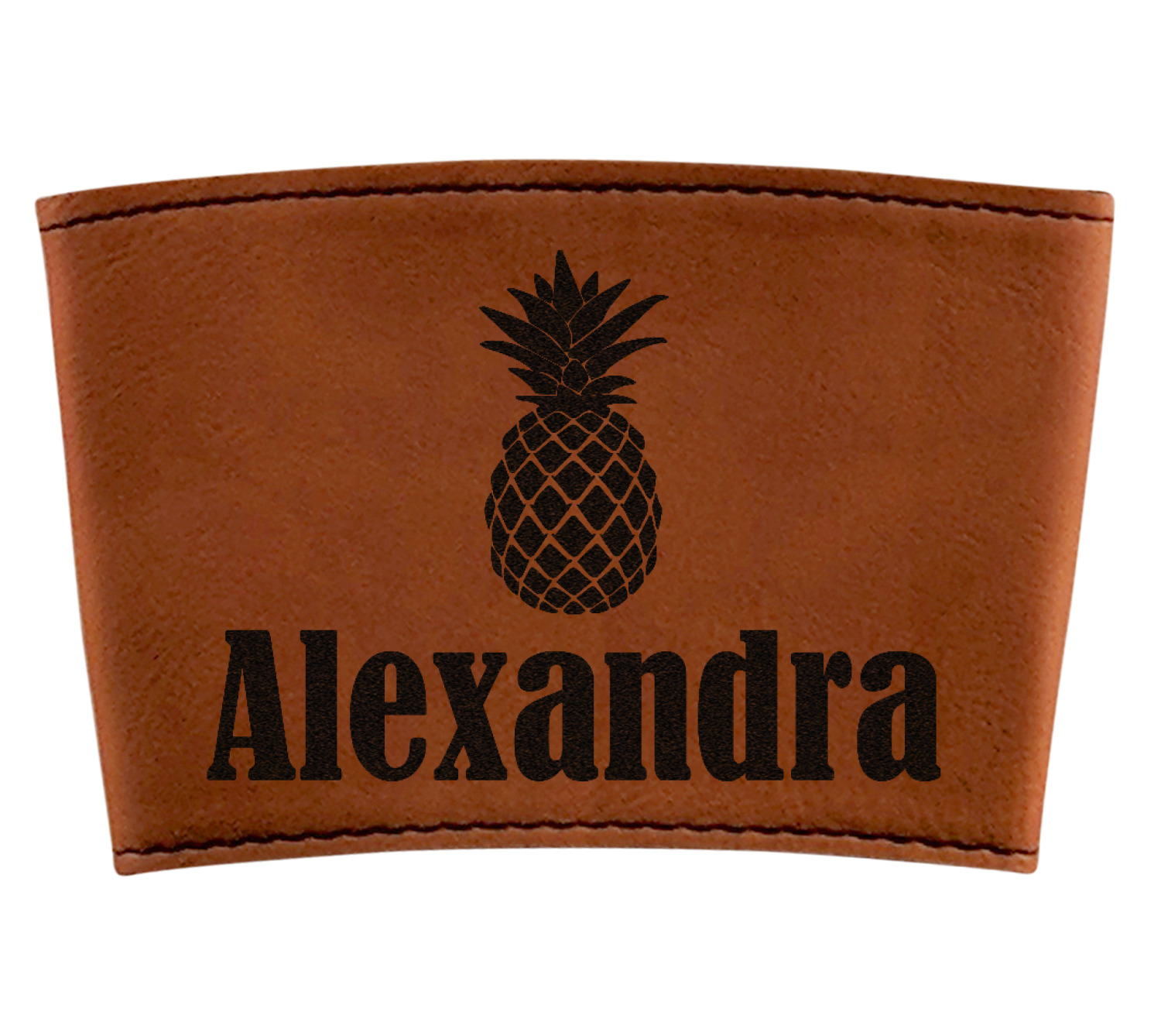 This cup sleeve is made from a suave, cognac-brown leatherette and finished with an intricate, black stitch. The interior of this can sleeve is fabricated from a thin foam material to help insulate your mug's contents. The sleeve is specifically made to suit tapered glasses or mugs, so the top's diameter is 3.5 inches, while the bottom's diameter is 2.75 inches. Your customized design will be laser engraved into the leatherette, leaving behind crisp, black imprint. With these products, we provide you with the option of engraving the front and back, or the front only.