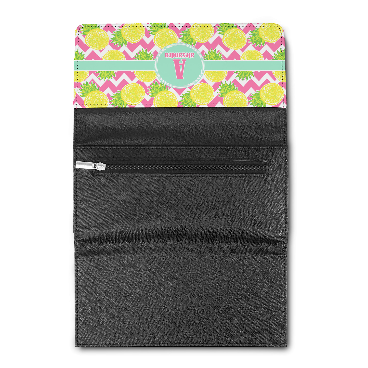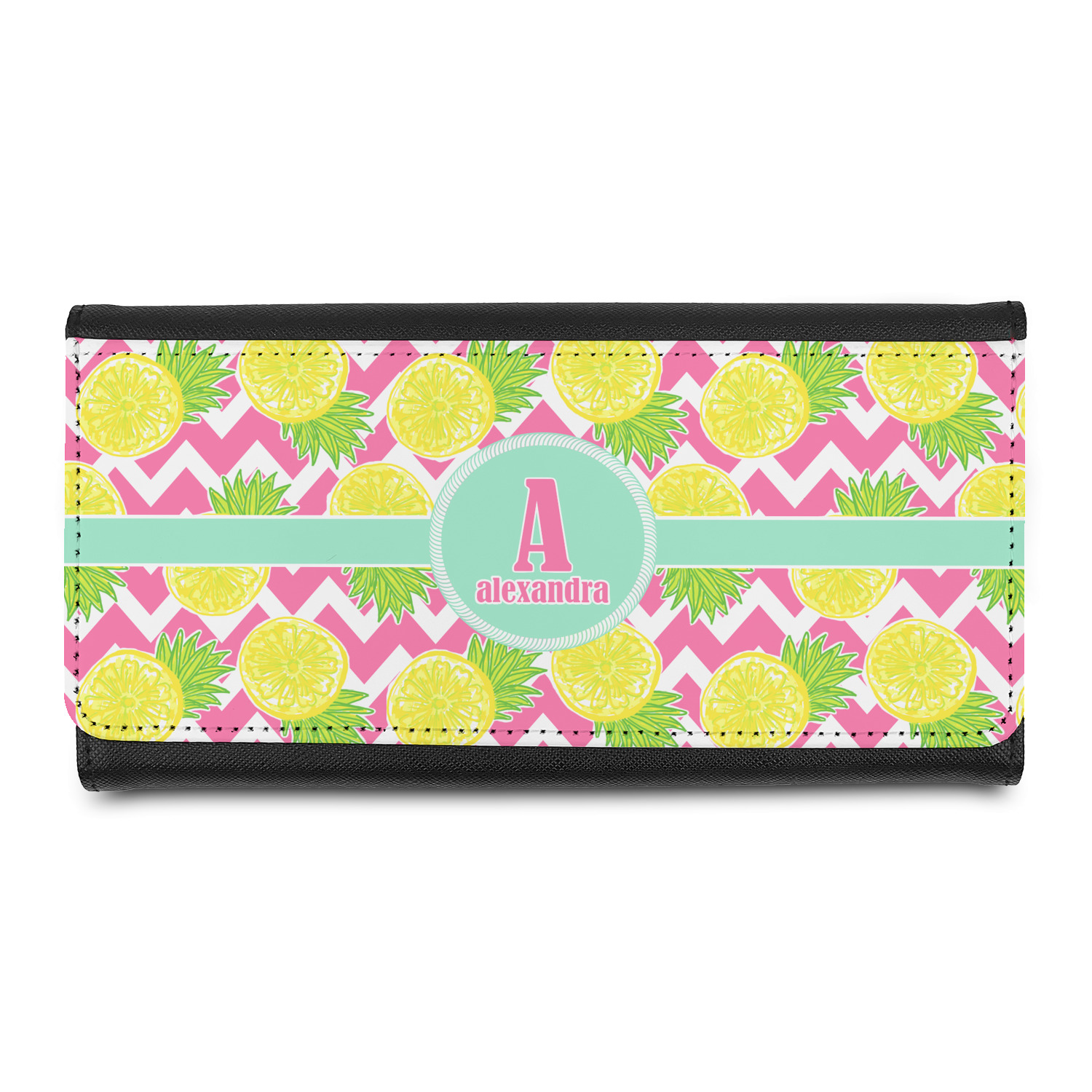 The main design has a background with bright pink and white chevron with some crazy yellow and lime pineapple slices scattered on top. A soft mint color is used for the ribbon and label, while a pink is used for the personalized name and initial.