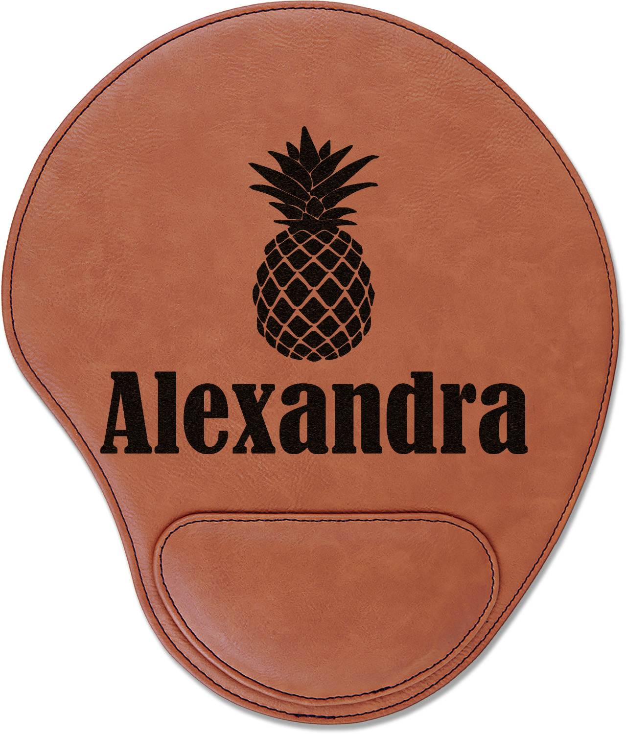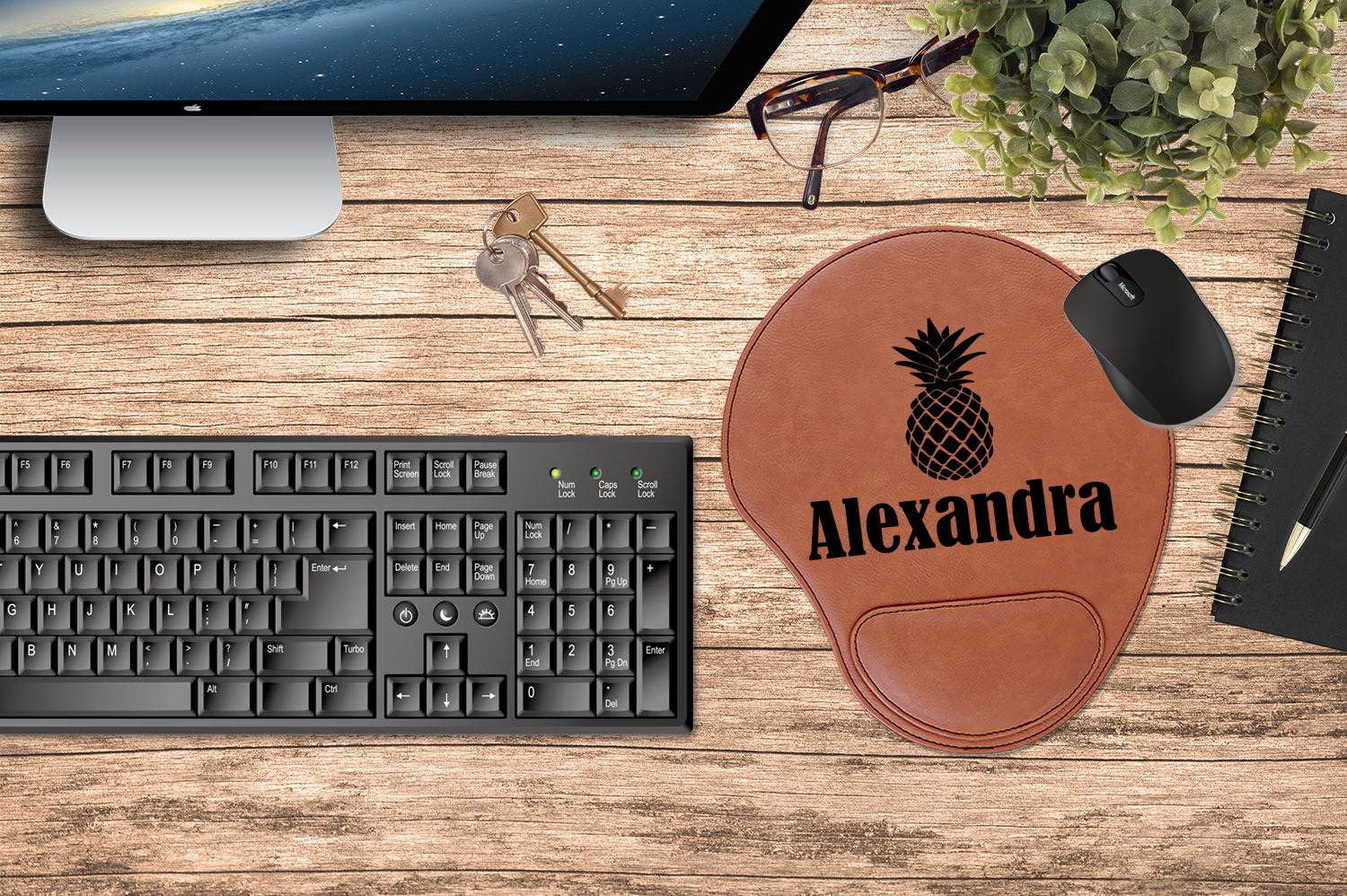 In a rounded shape, this mouse pad is made of a luxurious, cognac-colored leatherette. The nature of this material allows your mouse to glide smoothly across its surface. Strong stitching lines the edges to guarantee stability and strength. As added support for tired wrists, your personalized mouse pad features a supportive wrist rest at its bottom. This model measures at 10.25" x 9", while its wrist pad is approximately 5" x 2.75", with a thickness of 0.75". Your personalized design is laser engraved into the front face of this mouse pad.