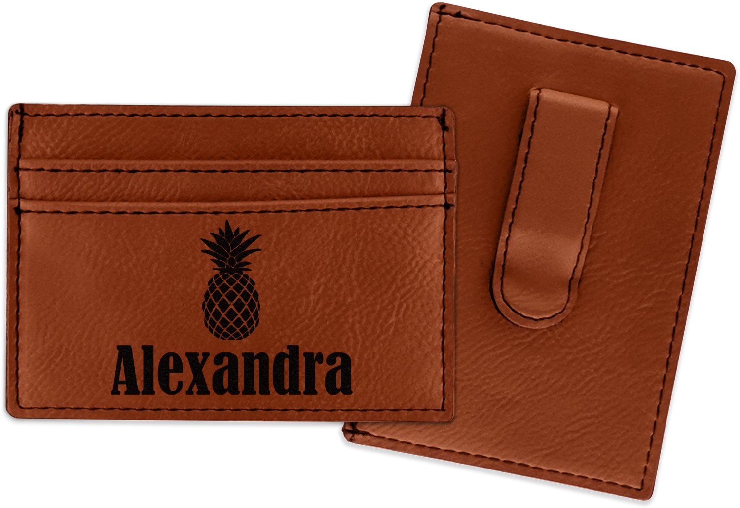 Made from a smooth brown leatherette material, these money clip wallets are the perfect accessory. They measure at approximately 4" x 2.75". On one side there is a money clip where you can slip in your cash. On the other side are three card slots for an ID and credit card or two. The money clip wallet will be laser engraved with your design on the side with the credit card slots. The graphic will come out as a black color.
