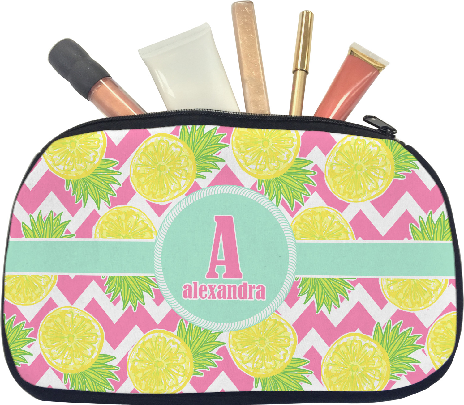Our personalized makeup bags are available in many different designs, patterns and colors - so you are sure to find one that will love. They are made of neoprene (same material as wet-suits) and thus are water resistant, so spillages in your makeup bag will not end up all over you purse. They are customized on one side and are black on the other side and the zipper is black as well.