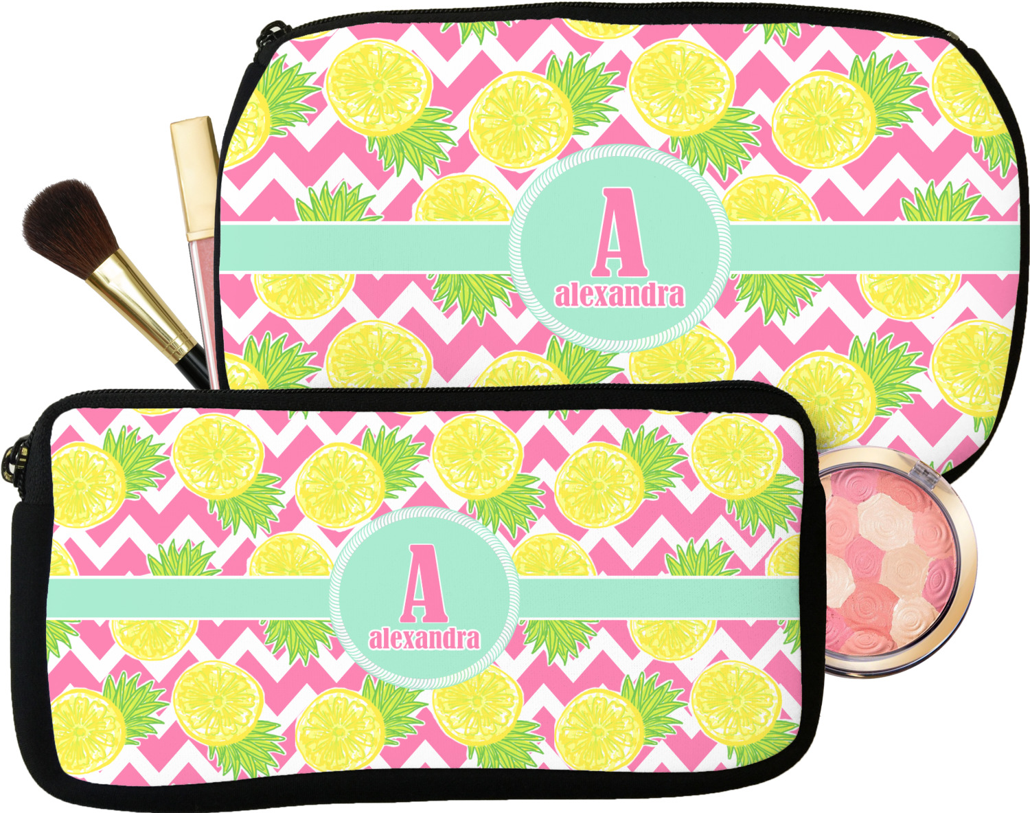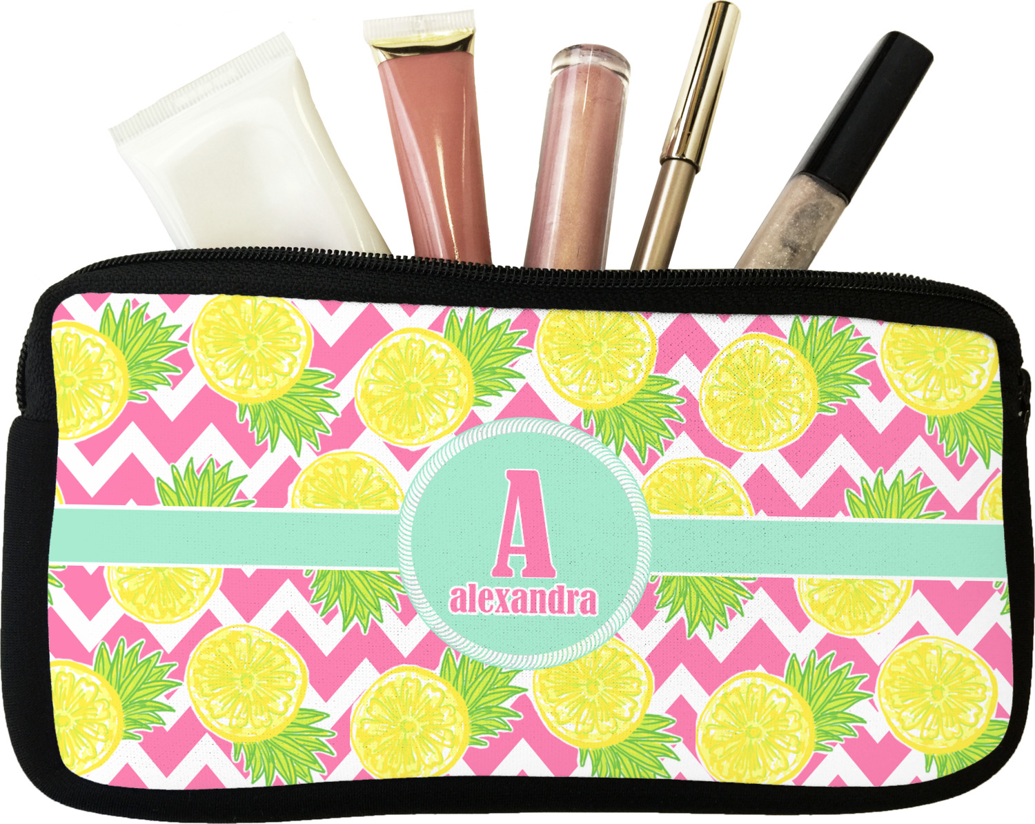 Our personalized makeup bags are available in many different designs, patterns and colors - so you are sure to find one that will love. They are made of neoprene (same material as wet-suits) and thus are water resistant, so spillages in your makeup bag will not end up all over you purse. They are customized on one side and are black on the other side and the zipper is black as well.