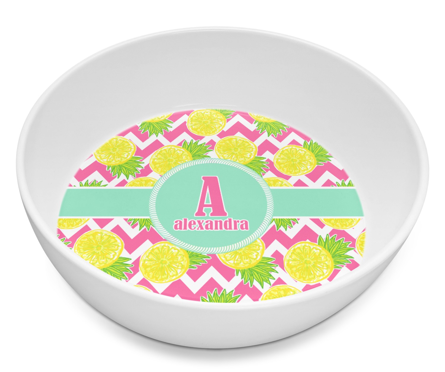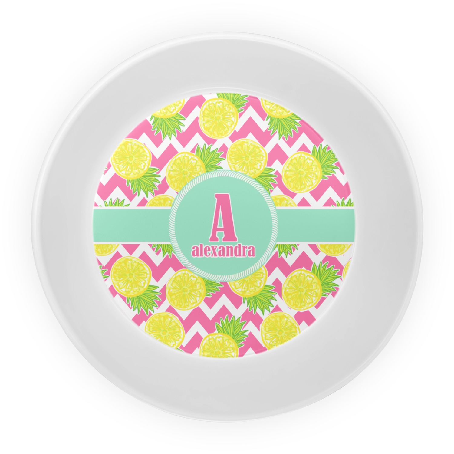 The main design has a background with bright pink and white chevron with some crazy yellow and lime pineapple slices scattered on top. A soft mint color is used for the ribbon and label, while a pink is used for the personalized name and initial.