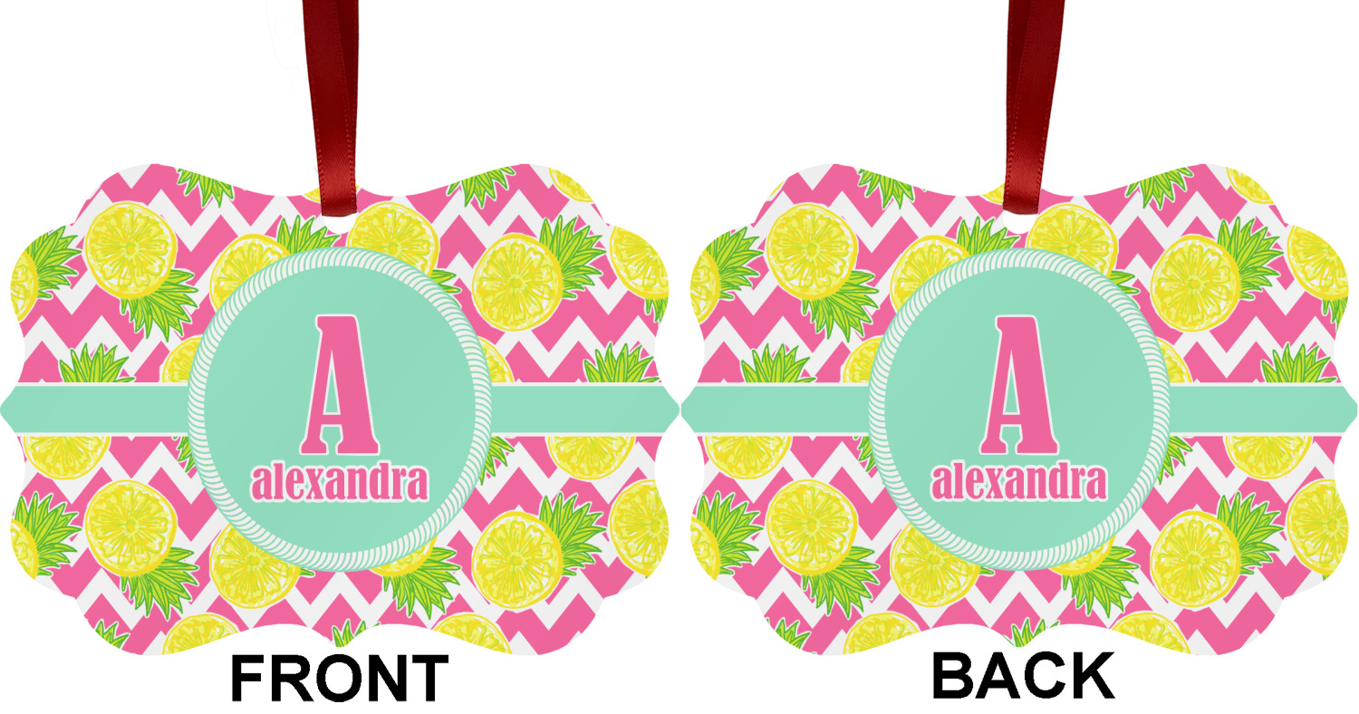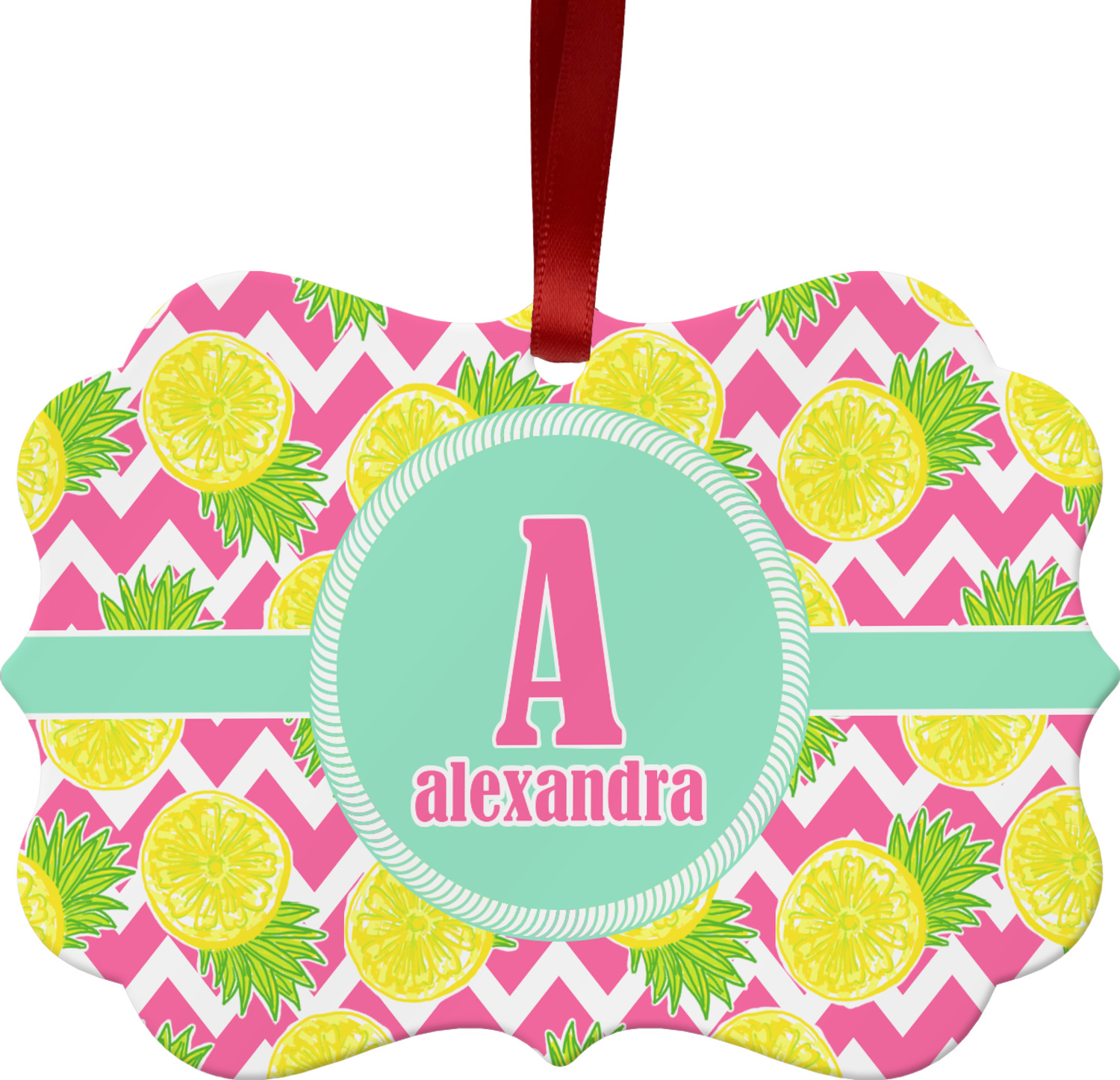 The main design has a background with bright pink and white chevron with some crazy yellow and lime pineapple slices scattered on top. A soft mint color is used for the ribbon and label, while a pink is used for the personalized name and initial.
