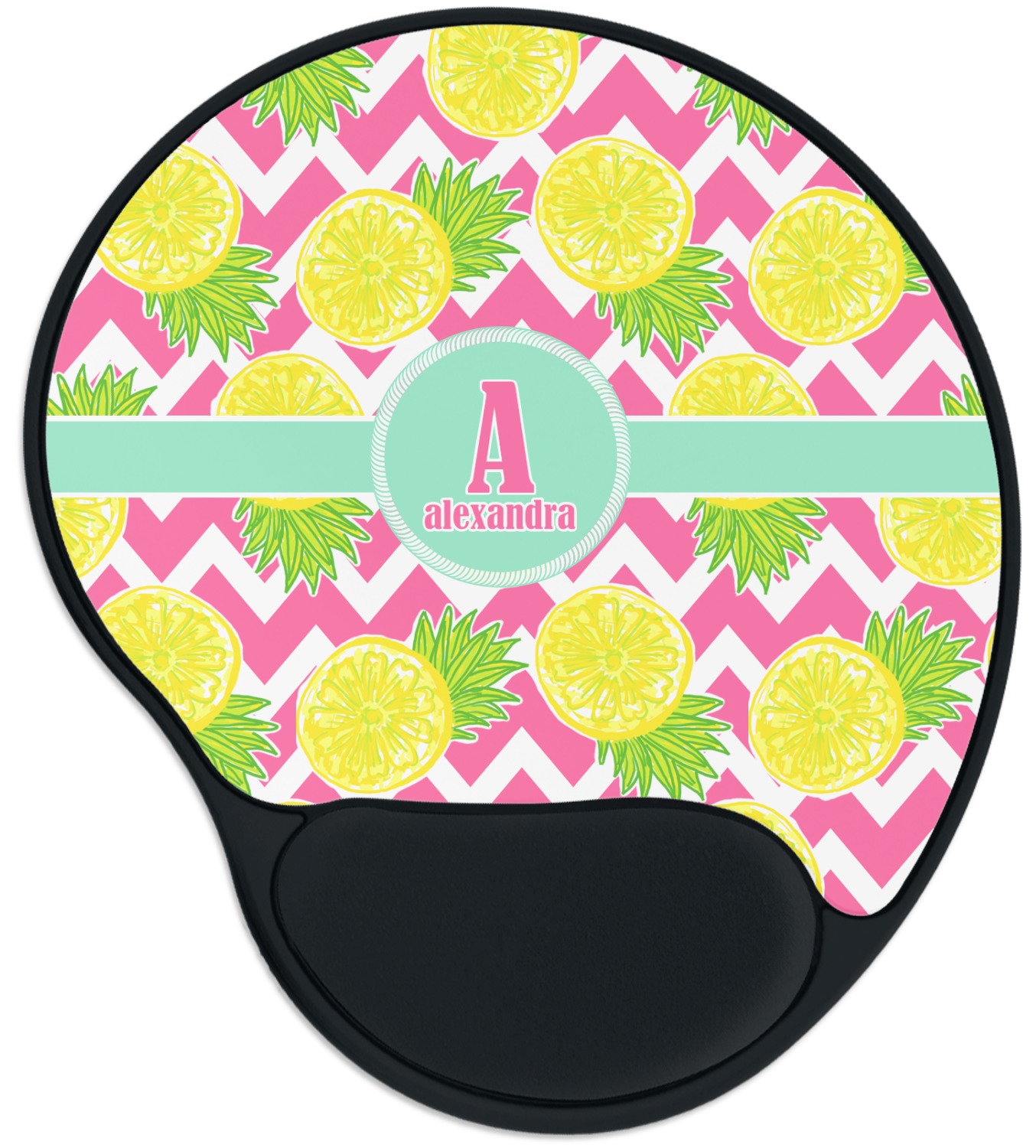 The main design has a background with bright pink and white chevron with some crazy yellow and lime pineapple slices scattered on top. A soft mint color is used for the ribbon and label, while a pink is used for the personalized name and initial.
