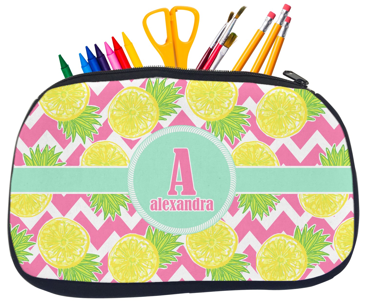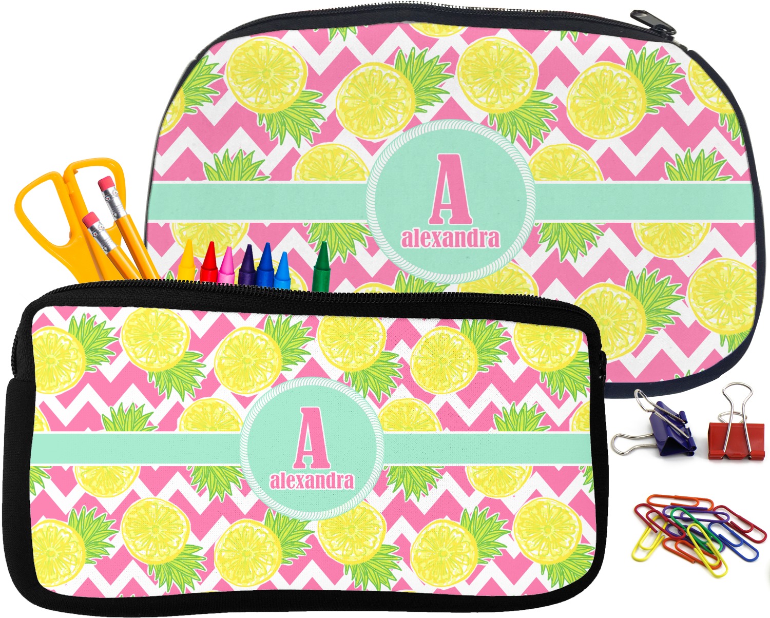 Built from durable neoprene, these pencil pouches, are water resistant, and prevent leaking ink from spilling into your backpack or purse. These custom pencil cases secure with a robust, black zipper. We print your personalized design on the front of this pouch, while the remaining sides a simple black color. These colored pencil cases [880] are sold in two sizes; our smaller version measures at 8.5 by 4.5 inches, while the medium measures at 10.5 by 6.5 inches. The smaller size is more suitable for holding pencils and pens, while our medium size can accommodate pencil sharpeners, scissors, and erasers.