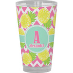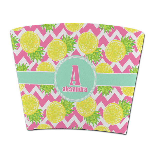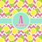 The main design has a background with bright pink and white chevron with some crazy yellow and lime pineapple slices scattered on top. A soft mint color is used for the ribbon and label, while a pink is used for the personalized name and initial.